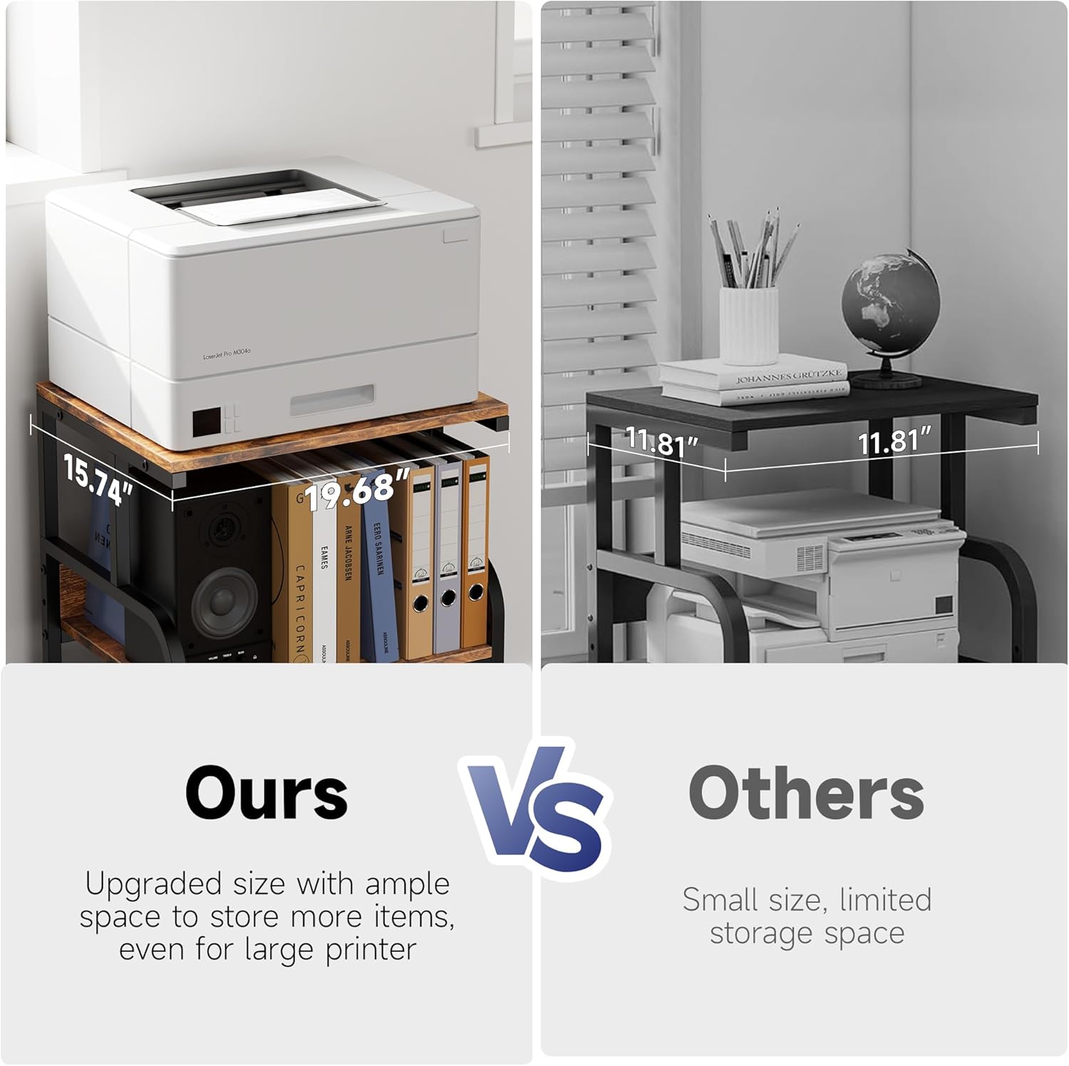 - 【Customizable Height for Versatile Storage】 Transform your compact workspace with 5-level adjustable height (9.45" range) on the middle shelf! Perfectly adapt for bulky laser printers, 3D printer stands, or mini fridge stands by tailoring tier spacing. Measuring 19.68”Wx15.75”Dx27.55”H, this space-saving printer table for home office maximizes vertical storage without sacrificing mobility. Industrial steel frame and 110 lb/shelf capacity ensure wobble-free stability even during high-volume printing. Optimize tight spaces as a mobile printer cart or under desk printer stand!