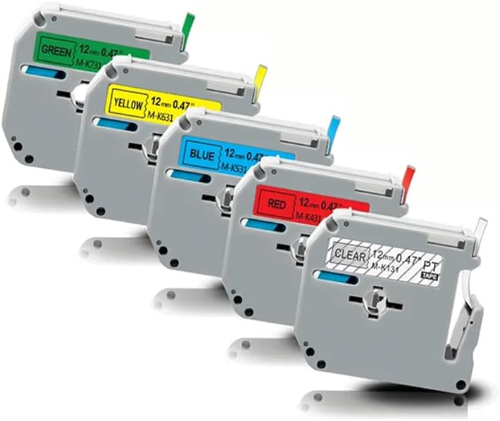 - Package: 5 Packs Compatible for Brother P Touch M-K131,,M-K431, M-K531, M-K631, M-K731 Label Tape; Color: Black Ink on Clear /Red/Blue/ Yellow/Green Tape; 12mm (1/2 inch) Width, 8m (26.2 feet) of Each M-K131s Label Tape.