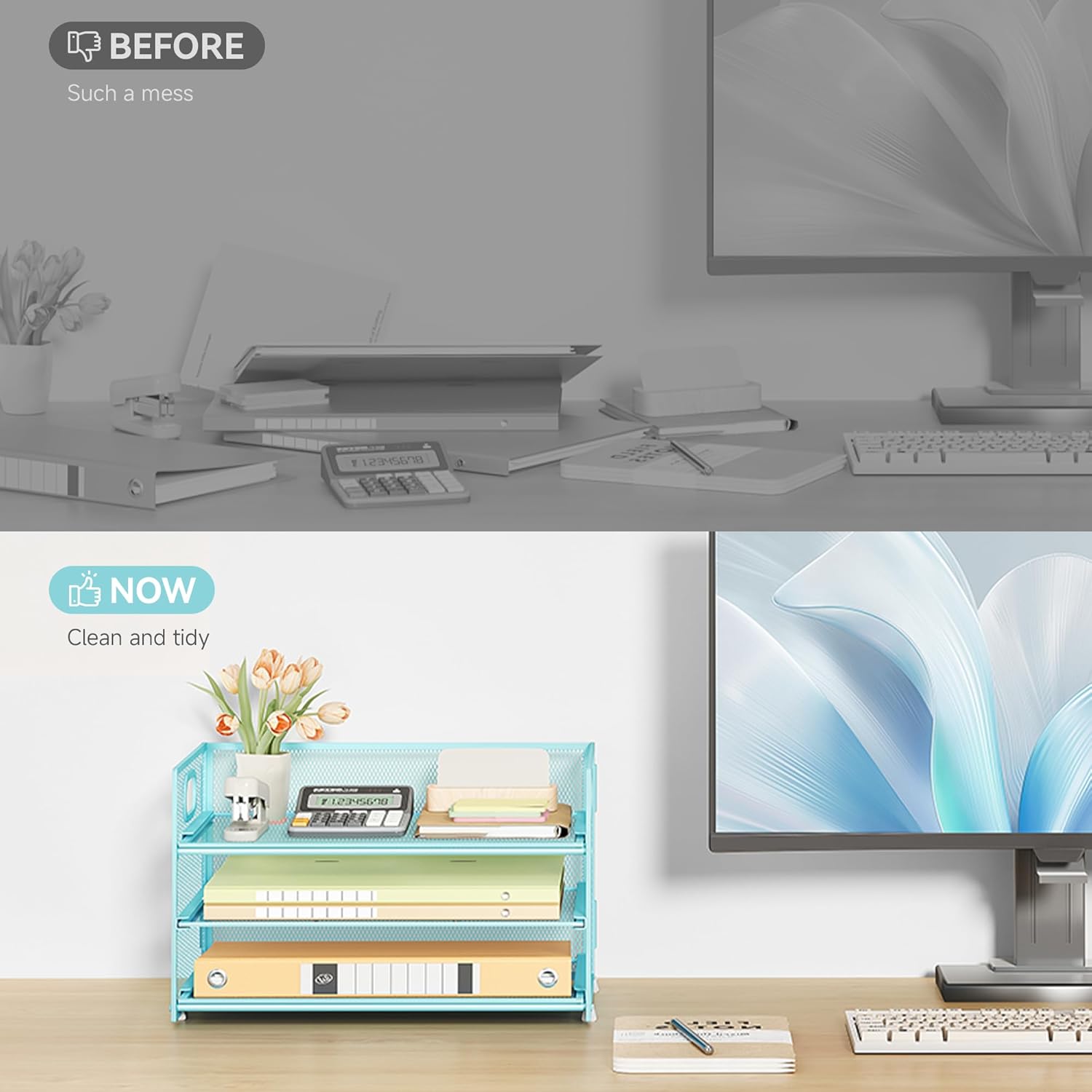 - Paper Organizer Function and Usage: The mesh desktop file organizer can hold various items including paper, folders, books, bills, notebooks, etc. The open design enables quick identification and access to contents, helping to declutter and organize the desk