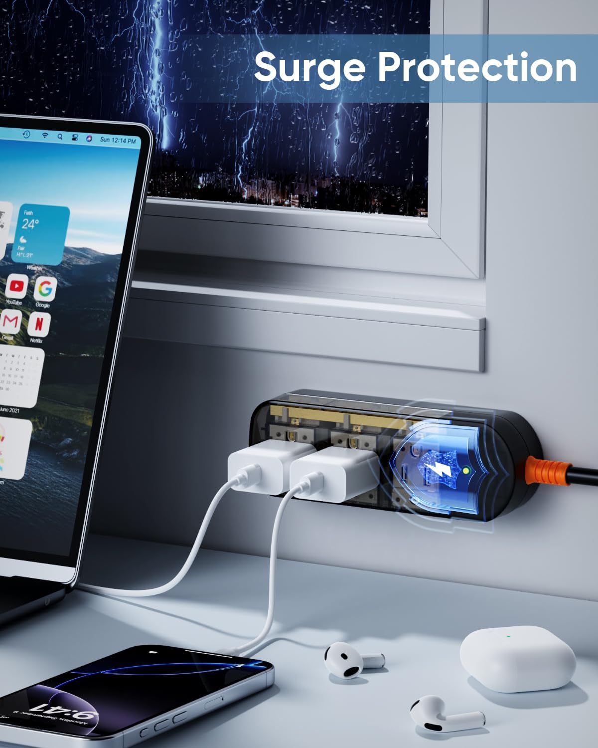 - 【Versatile & Weatherproof】Welcome to our IPX6 rated power strip, resistant to rain, water splashes, and flowing water. It reroutes any liquid intruding the sockets through the back, ensuring functionality in environments like kitchens, outdoors and more.