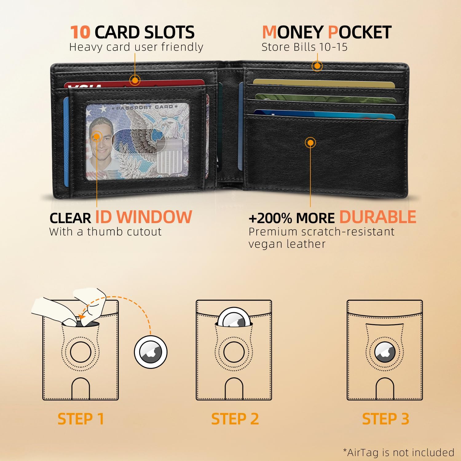 - NO MONEY CLIP DESIGN - Measuring 4" x 3.5", this slim men's wallet boasts a bill compartment that occupies less space than a metal money clip, effectively reducing bulk. It includes 11 card slots, featuring a quick-access slot on the front, 10 slots on the wallet sleeves, and 1 integrated AirTag pocket. (AirTag is not included)