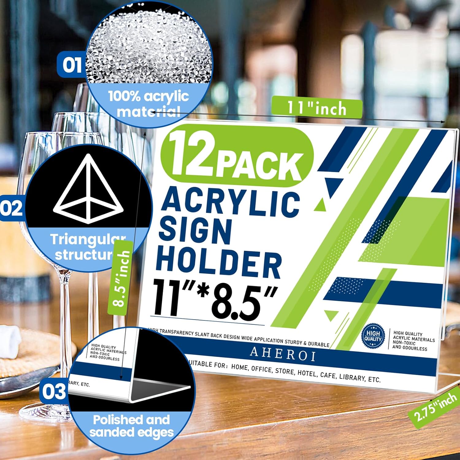 Aheroi 12Pcs Acrylic Sign Holder 8.5 x 11, Horizontal Clear Sign Holders 8.5 x 11, L-Shape Acrylic Paper Holder, Plastic Sign Holder Paper Holder Display Stand for Menu Document Picture Frames