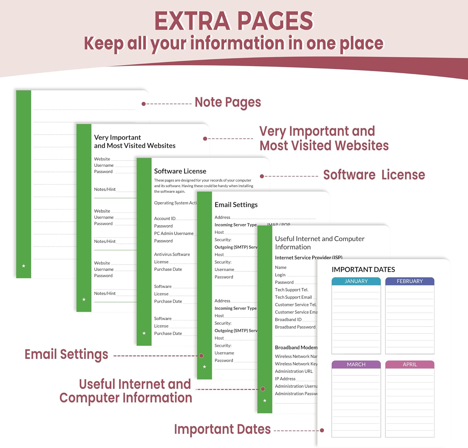 - AMPLE WRITING SPACE: This password log has 160 pages and can store up to 576 passwords. Each password entry has three lines and a colored divider for easy organization. In addition, you can record your important dates, Internet service provider, wireless router settings, Email settings, software licenses, most visited websites, and other notes.