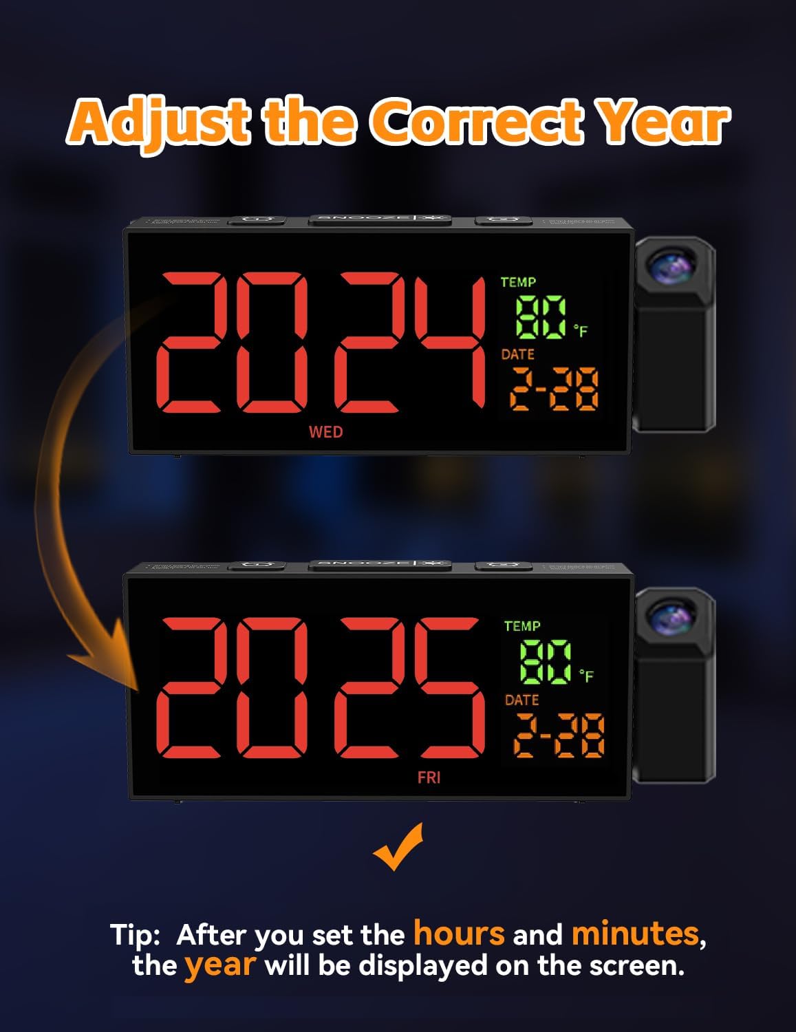 - Accurate Day of the Week Display - Adjust the year from 2024 to 2025. Set the correct year and date, and our product will accurately show the corresponding day of the week. Tip: After setting the hours and minutes, the year will be displayed on the screen