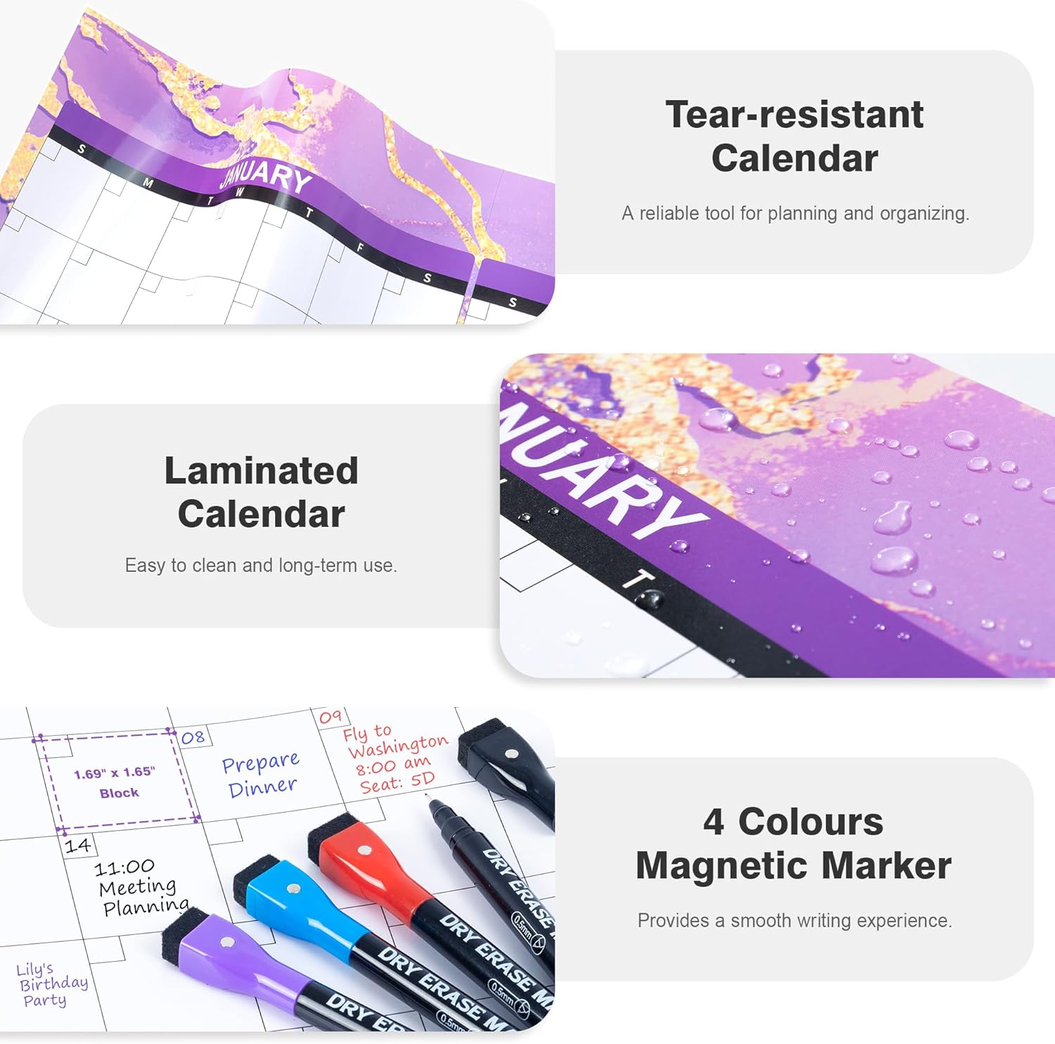 - ✨ Dry Erase Wall Calendar : is made of PET Film and 300 grams Copperplate Paper, providing a durable surface that resists scratches and smudges, while the sturdy Copperplate Paper backing keeps it in place without curling.