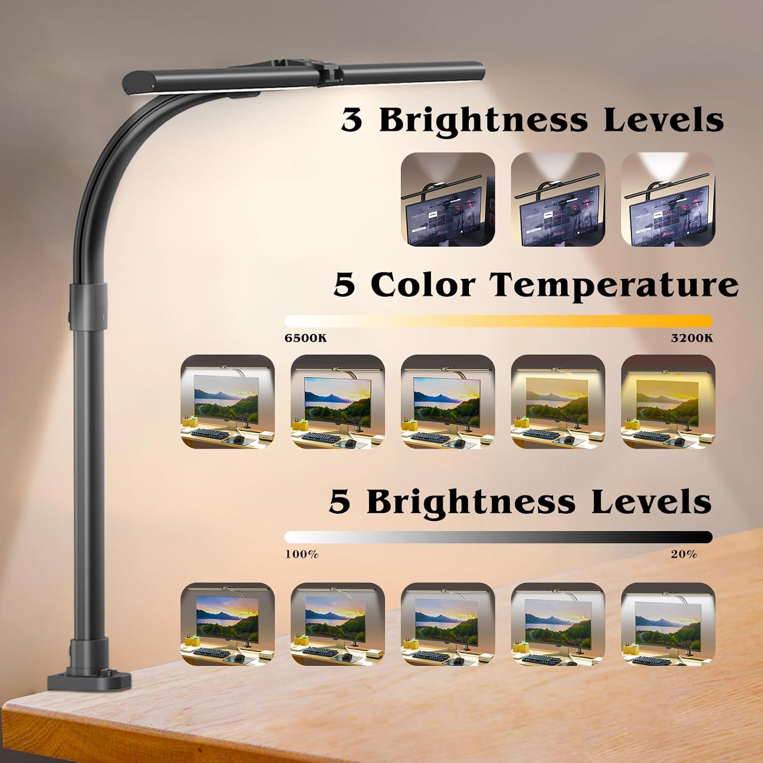 Led Desk Lamp for Home Office,24W Bright Eye-Caring Desk Light with Clamp,5 brightness and 5 temperatures Dimmable Workbench Task Light, Adjustable Gooseneck Table Lamp for Monitor Study(black)