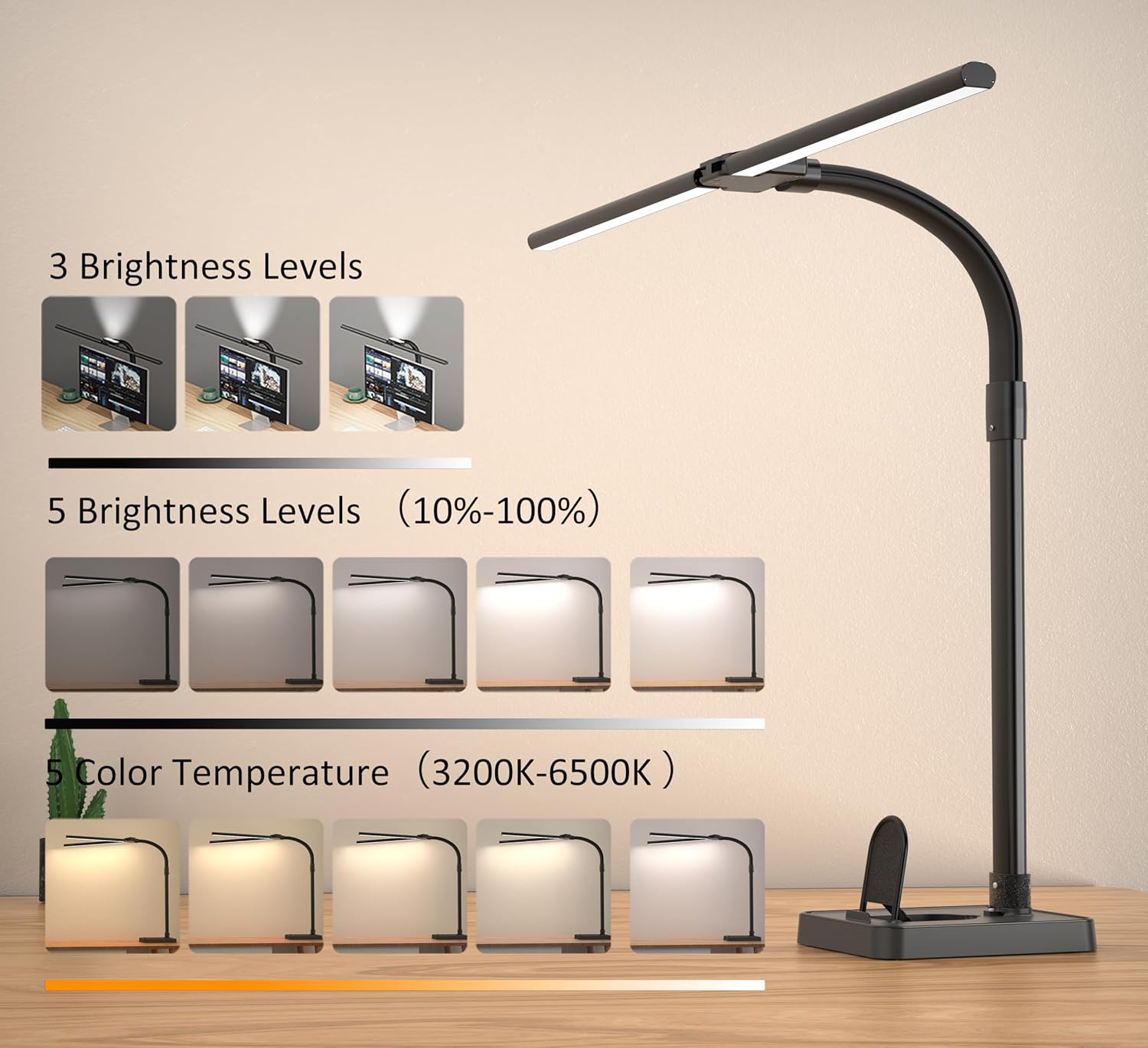 Double Head LED Desk Lamp, Architect Desk Lamps for Home Office, 24W Brightest Workbench Office Lighting-5 Color Modes and 5 Dimmable Eye Protection Modern Desk Lamp (Black-Desktop, Big)