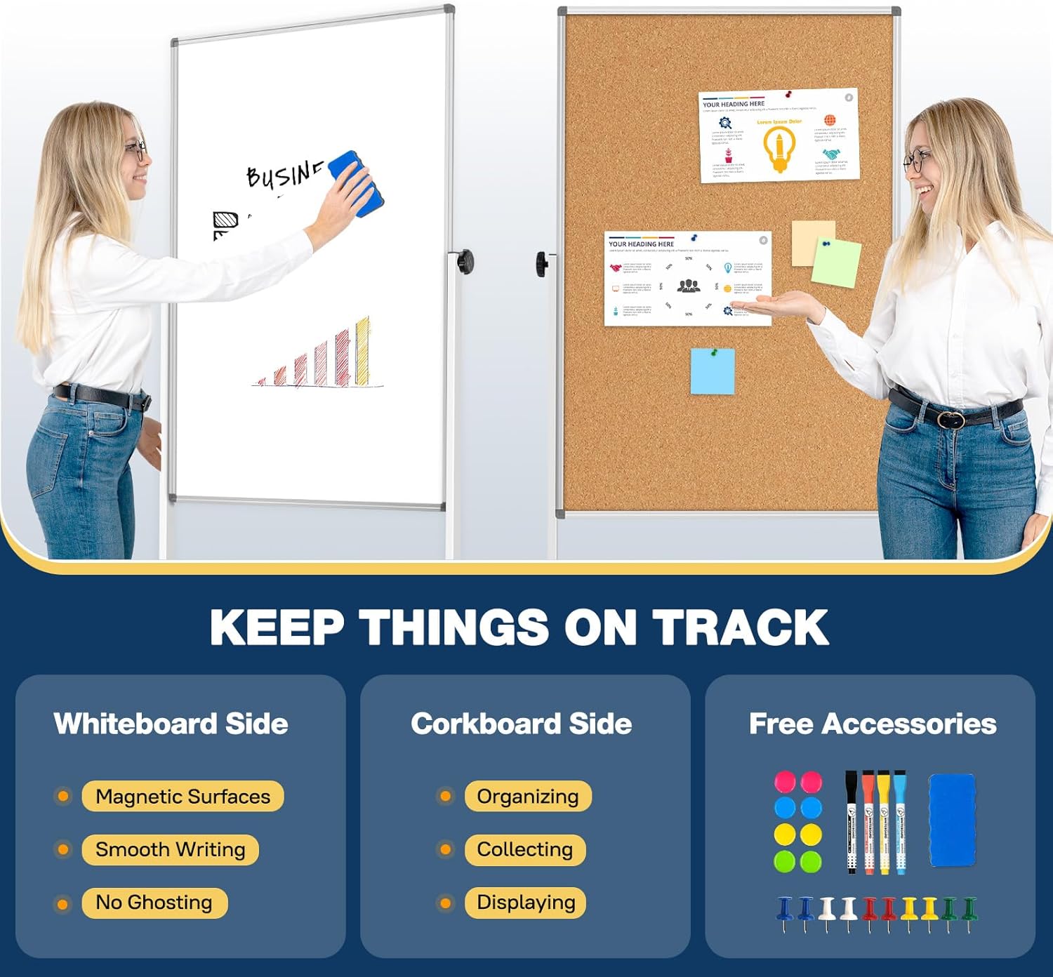 [15 Sq/ft] Large Rolling Whiteboard & Corkboard Combo with Stand, 28"x40" Reversible Double-Sided White Board Cork Board Combination, Mobile Dry Erase and Bulletin Boards on Wheels