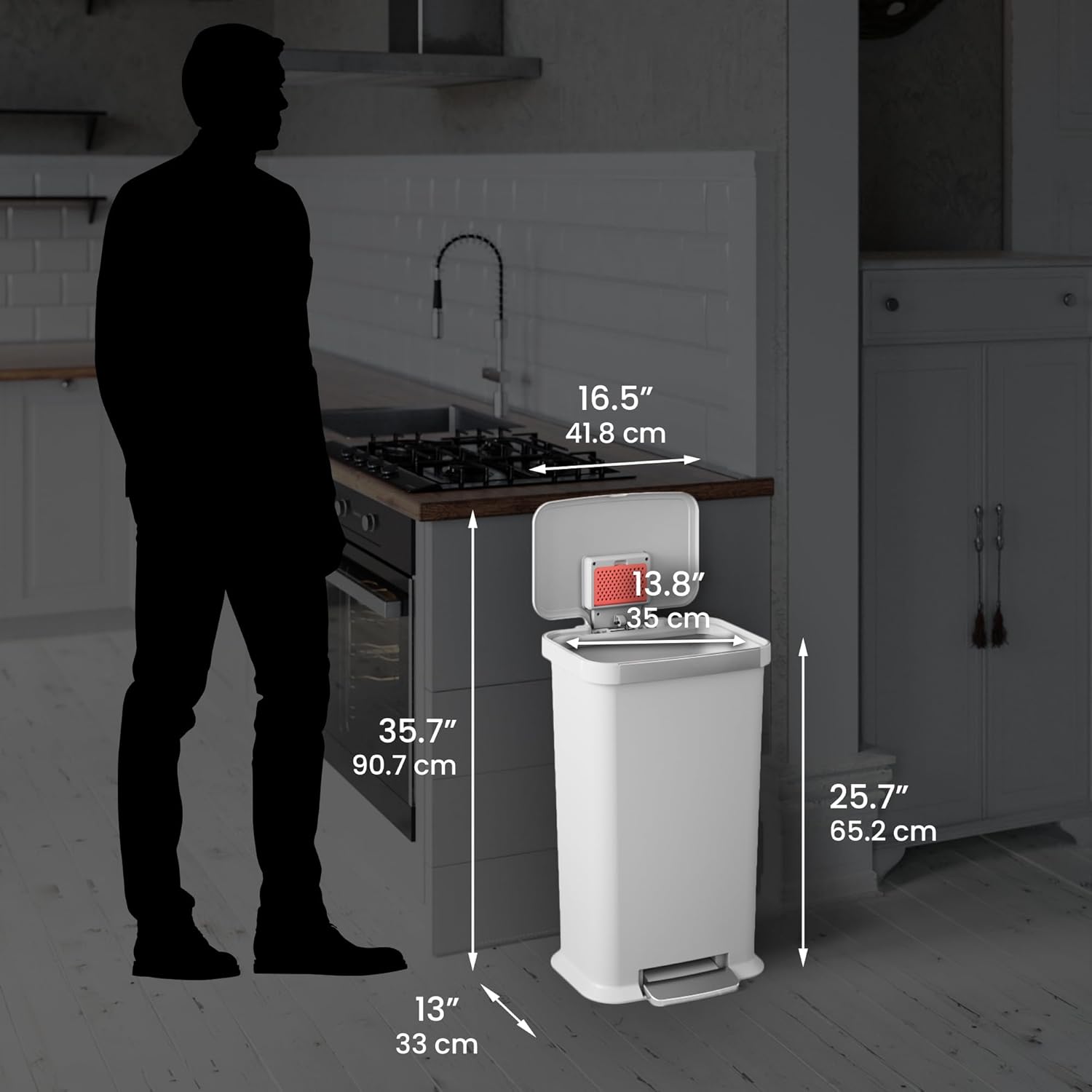 - SLEEK & MODERN DESIGN – Smooth contours lend elegance to any space with this large kitchen trash can. We design stylish trashcans for kitchens that are modern, classic, and sophisticated.