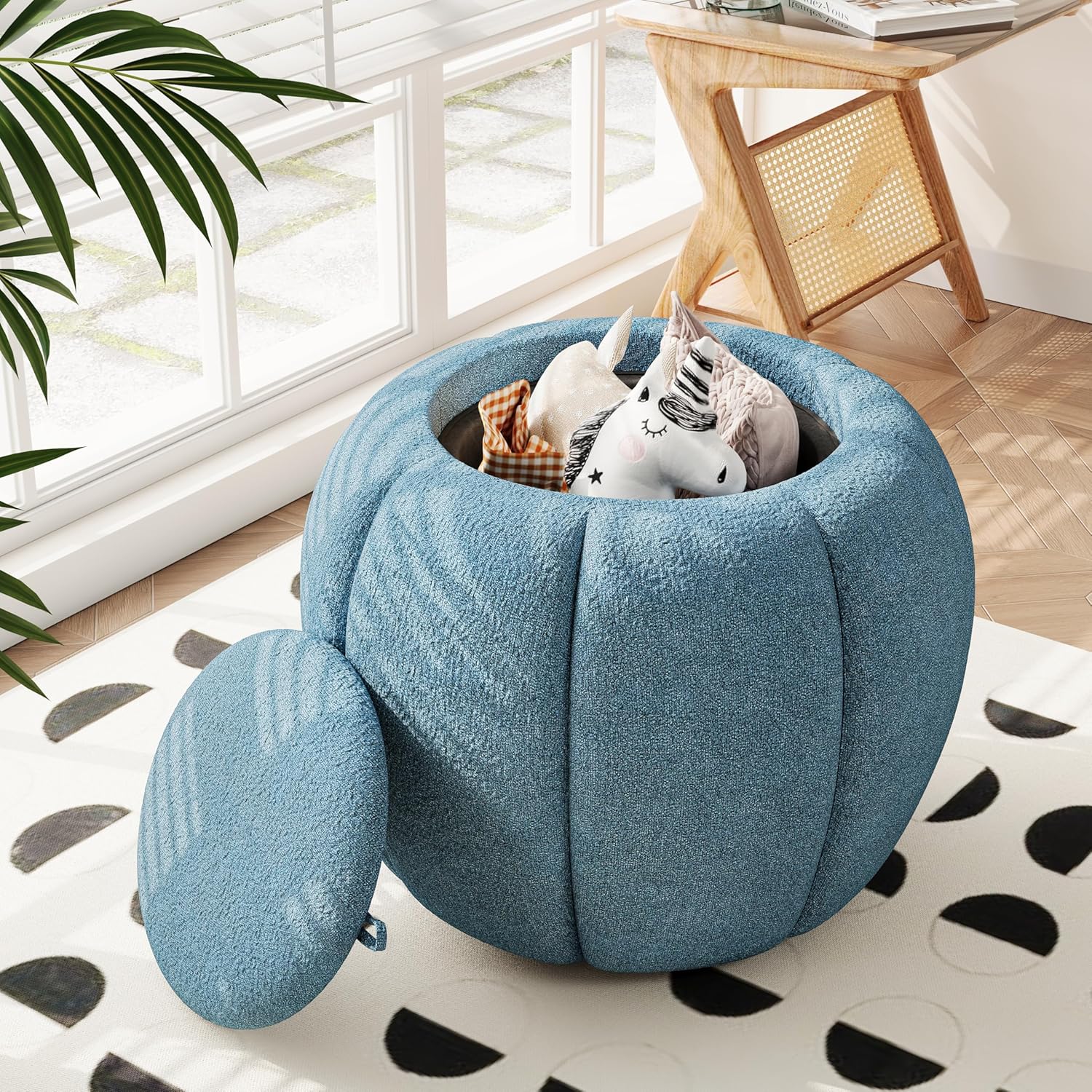 Storage Ottoman, Round Ottoman with Storage, Upholstered Soft Vanity Stool for Living Room, Foot Stool Ottoman for Bedroom, Entryway (Navy Blue)