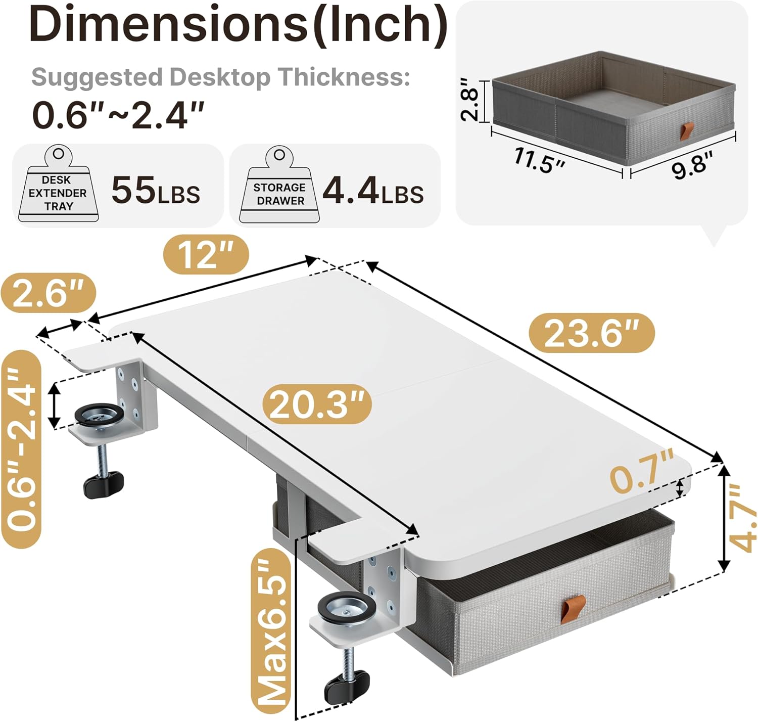 Desk Extender Tray, 24" x 12" Clamp On Desk Shelf, Desk Extension with Storage Drawer, Table Desk Arm Rest, Clamp On Keyboard Tray for Office and Home, Workstation Organizer, Medium, White