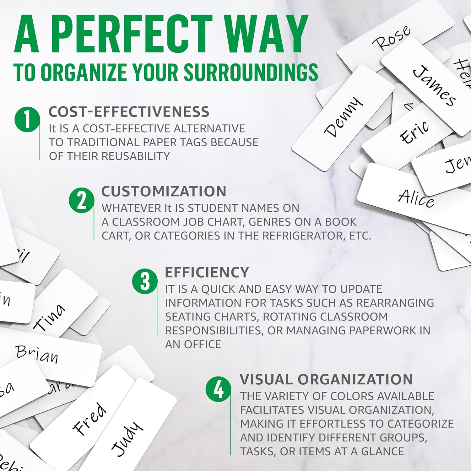 - Dry-Erase Surface - A reusable writing surface of our magnetic dry erase labels 3.2x1.2 in allowing you to jot down notes, names, tasks, or chores repeatedly without the need for paper wasting.