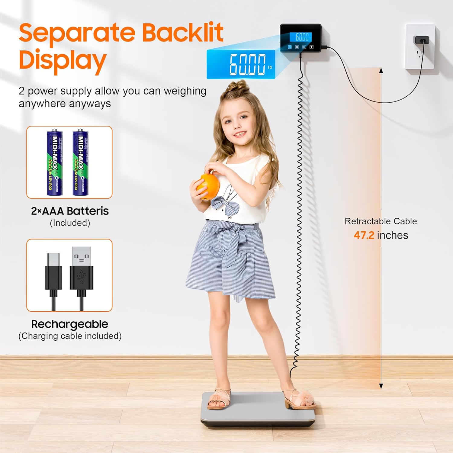 - Separate Large LED Display: The shipping scale has a larger backlit display than the marketed products, allowing for clearer readings and use at night and in dimly lit environments. Weight scale's thoughtful notch design makes it easy to store the display in one place