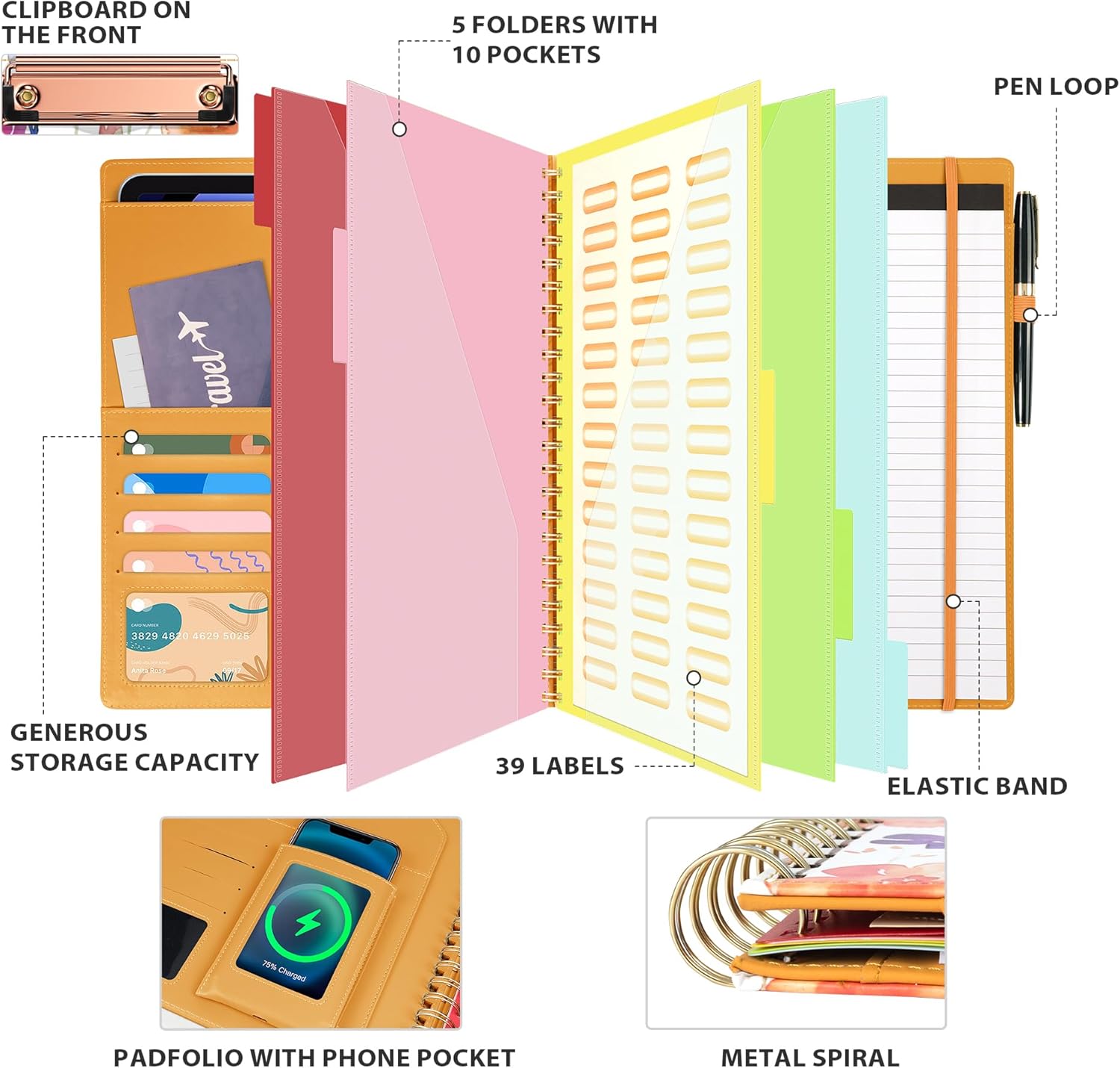 - Versatile Organizer with Large Capacity - Our clipboard with storage is 360°ー foldable and features a retractable transparent phone pocket (with a charging port) that can accommodate a 6.7" phone, the pockets on the left side are of big capacity to hold your cards, passport, ipad and other valuables. It also offers 5 folders and divider with index stickers on the right side to keep your files well organized, which is perfect for all your daily routines and business travel needs