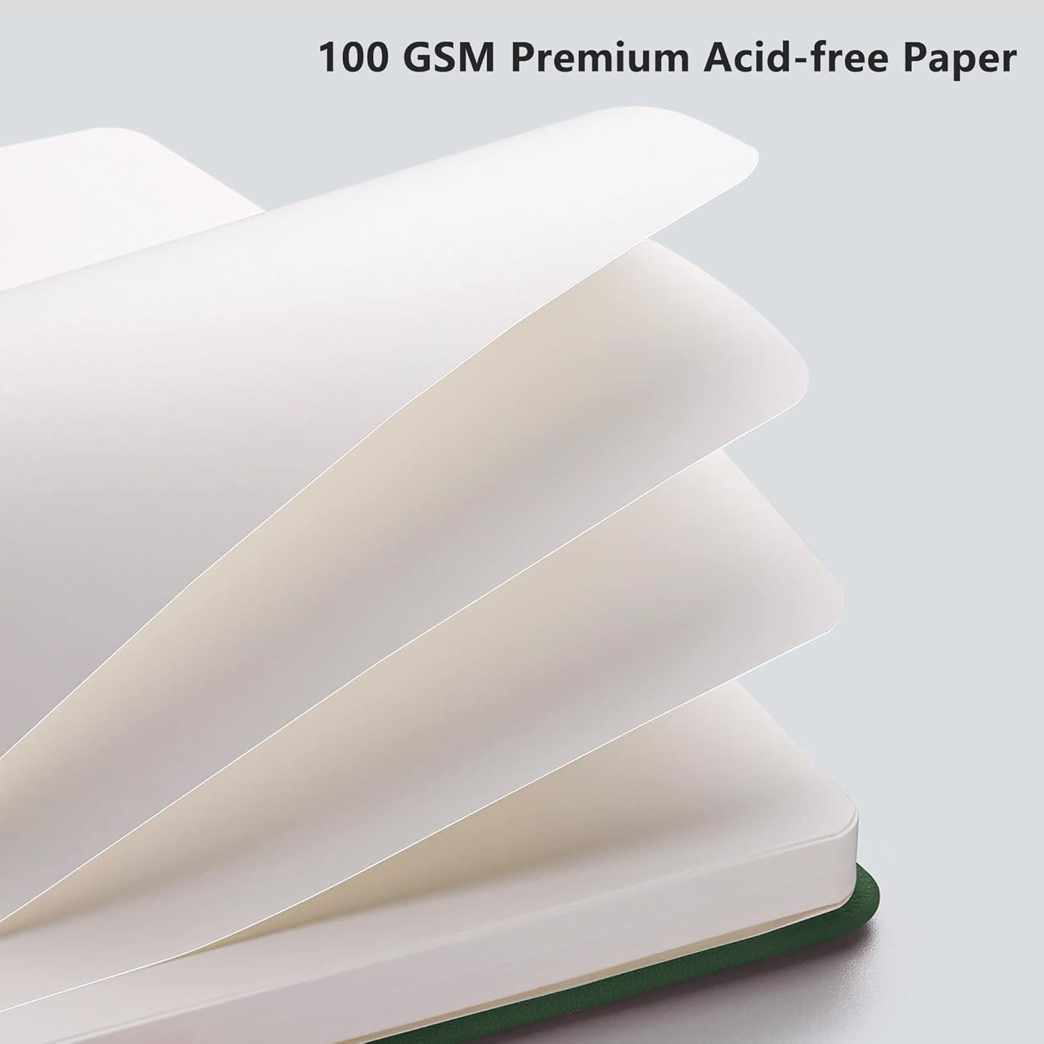 - PREMIUM PAPER: Crafted with time-resistant 100 GSM paper, our blank journal notebook preserves thoughts flawlessly while resisting ghosting/bleed-through with most pens. Acid-free material ensures long-term preservation, and its smooth surface enhances writing clarity - blending durability and premium performance