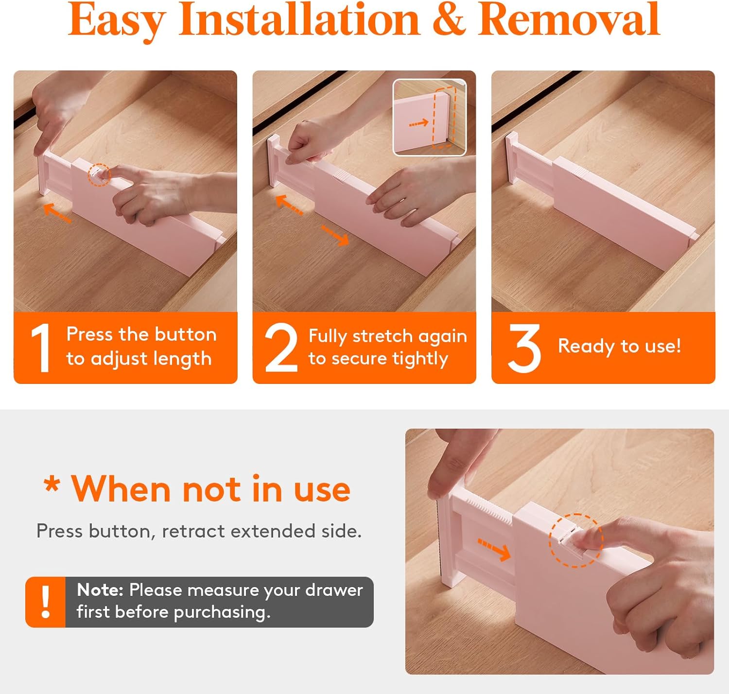 - Easy to Install: Press the top button and stretch to the desired length, then fully extend again to secure in place; The strong spring tension keeps each drawer organizer securely upright; To retract, press the top button and push the stretched side