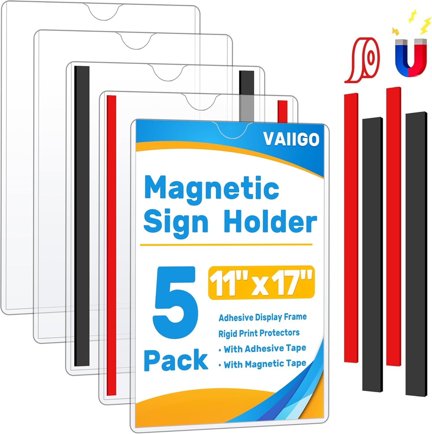 Magnetic Sign Holder 11 x 17 Adhesive Frame 5 Pack, Rigid Plastic Document Paper Holder with Magnet & Adhesive Strips, Wall Door Sign Holders Magnetic Frame for Office Home Store Restaurant