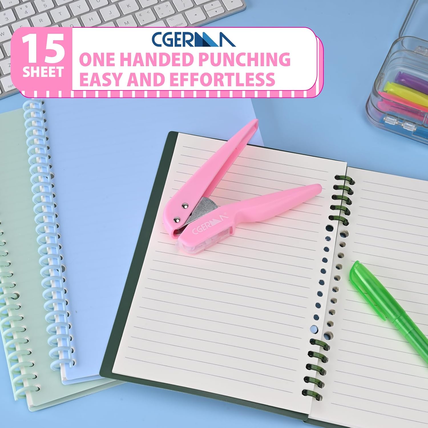 Single Hole Punch, with 30 Pcs Loose Leaf Binder Rings, 1/4" Hole Punches, 50% Labor Savings, Paper Hole Puncher, 15 Sheet Capacity, for Paper Cards Plastic Cardboard, Lightweight, Pink