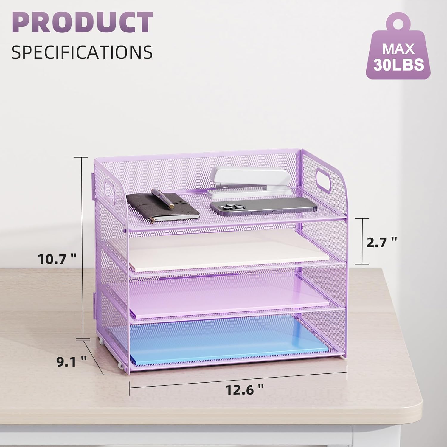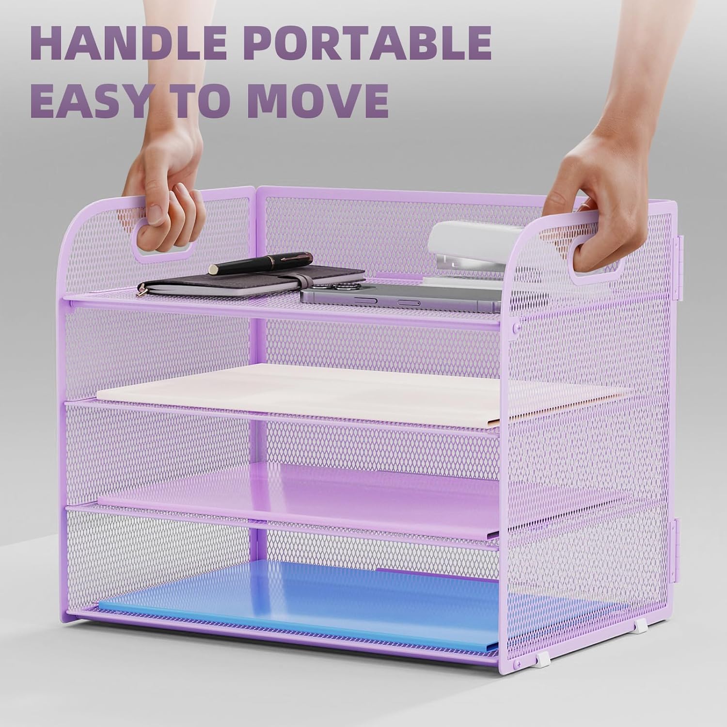 Marbrasse 4 Tier Paper Organizer Letter Tray - Mesh Desk File Organizer with Handle, Paper Sorter Organizer for Letter/A4 Office File Folder Holder (Purple, 12.6" x 9.1" x 10.7")