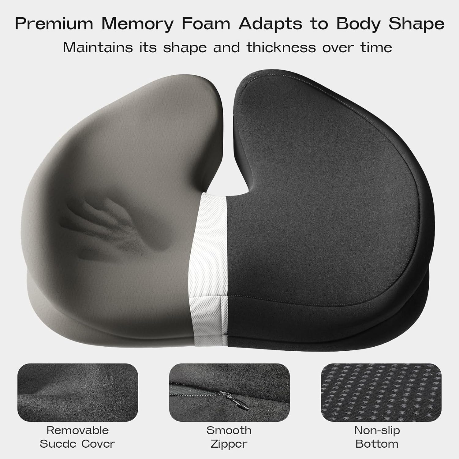 - 【Long Lasting Comfort】Our chair cushion for office chair is made of slow rebound high-density memory foam and features a non-slip bottom and soft removable black suede cover. All materials were certified by professional safety organizations to ensure safety and comfort for use.