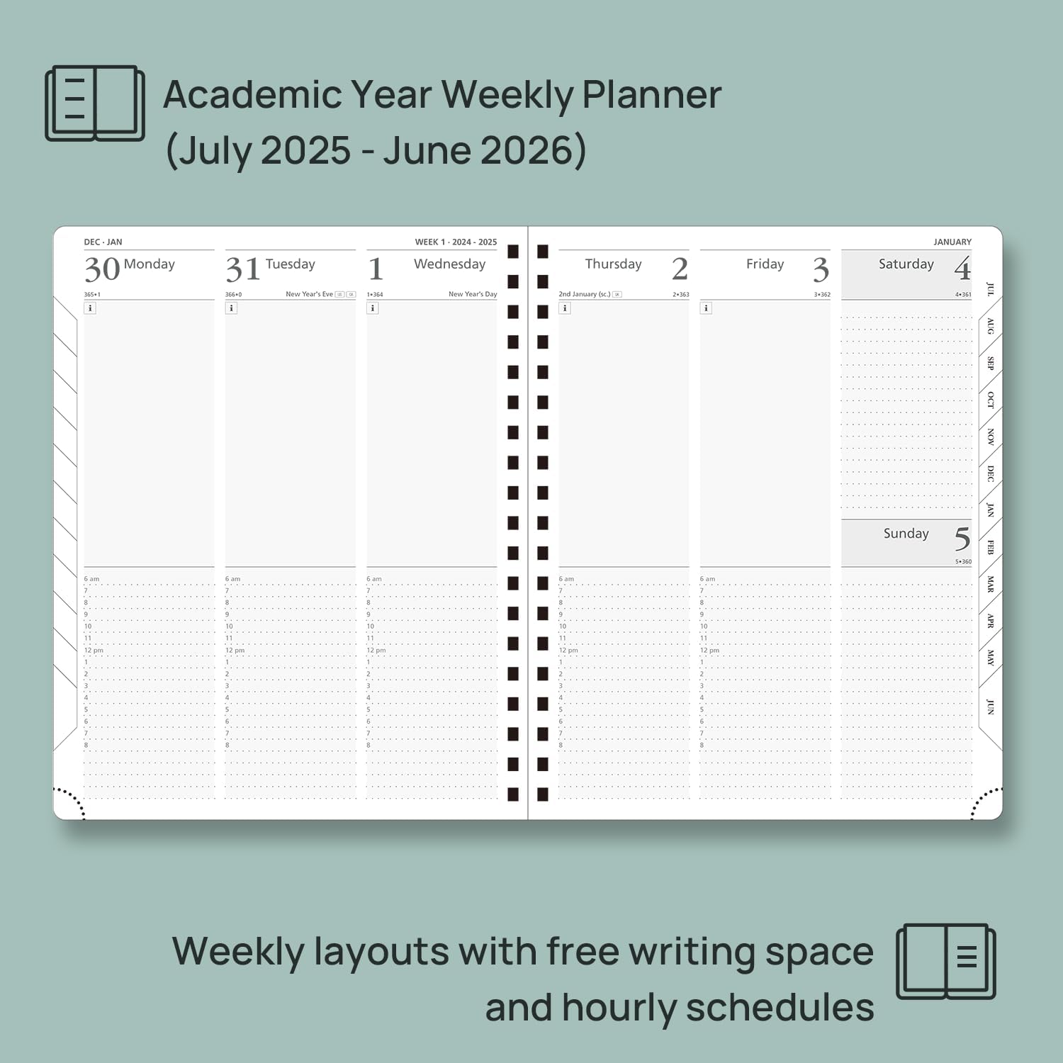 - WEEKLY CALENDAR 2025-2026: Our 8'' x 10'' Weekly Planner covers from July 2025 to June 2026, giving you the flexibility to start your planning at any point during the academic year. Featuring 2 Vertical Pages per week with Hourly Time Slots from 6 AM to 8 PM.