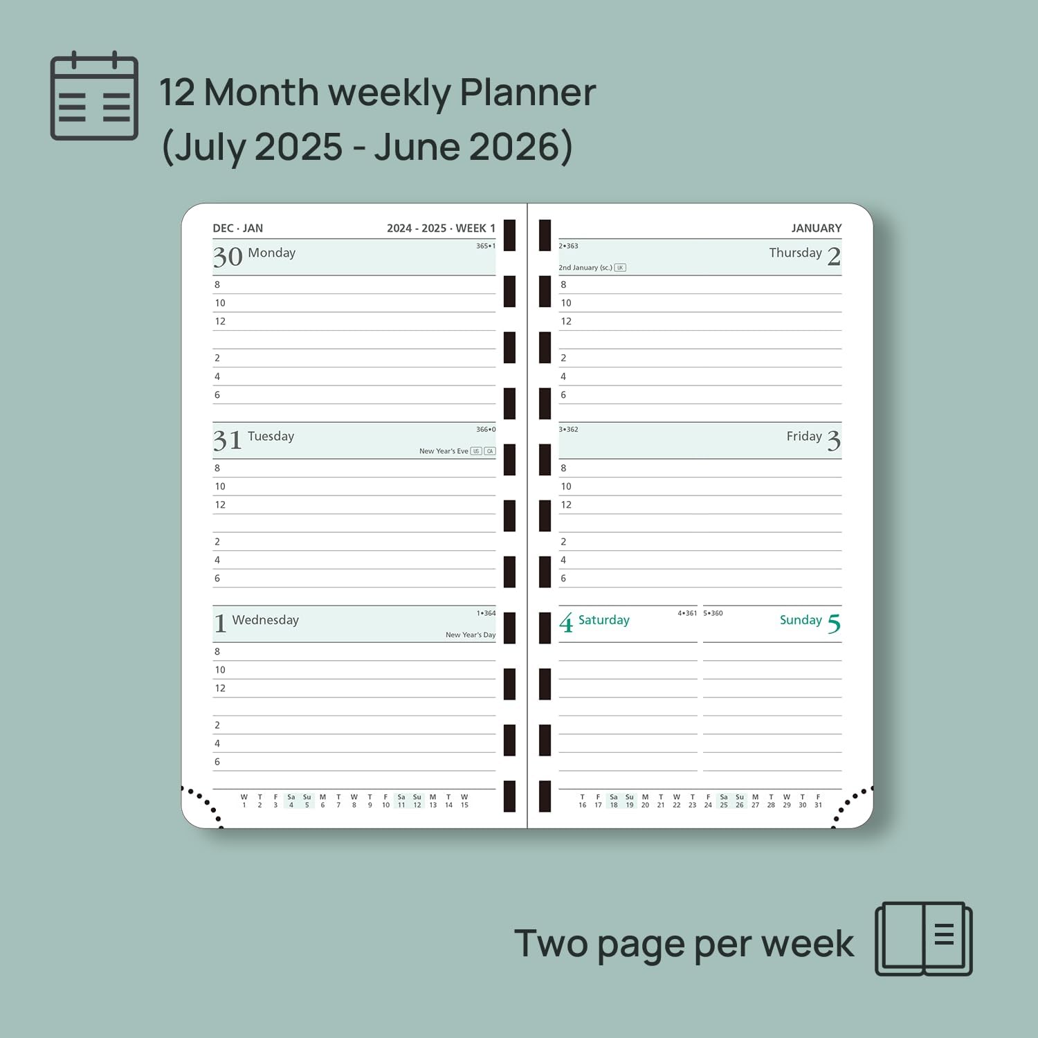 - EXTRA FUNCTION PAGES - Includes a 2025-2026 Yearly Overview, Holiday & Calendar, Monthly Expenses, Contact & Password pages, and 7 dotted notes pages for detailed jotting.