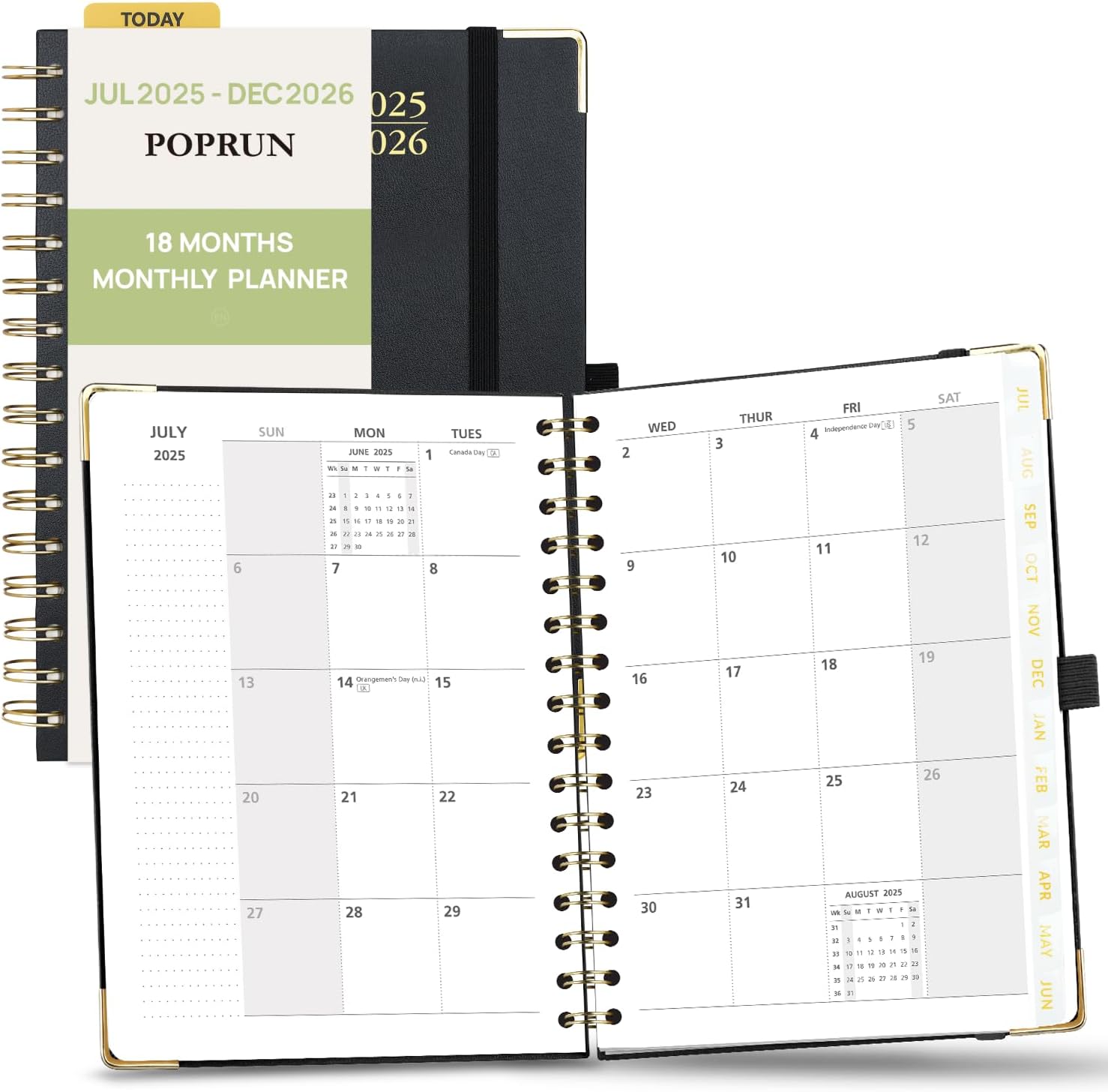 POPRUN Monthly Planner 2025-2026 Spiral Hardcover (6.25'' x 8.5''), 18 Months Calendar (Jul.2025 - Dec.2026)- 2 Pages per Month with Dotted Note Pages, Sunday Start, Laminated Tab - Black