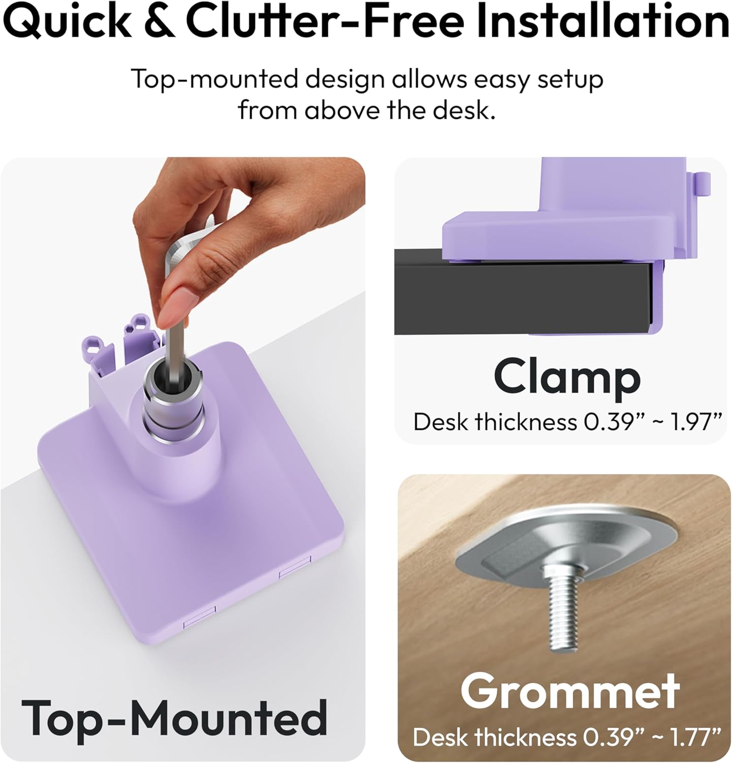 - Desk mounted design: Frees up valuable desk space, creating a more organized and spacious work area. Choose between a C-Clamp configuration (default) or by grommet installation.