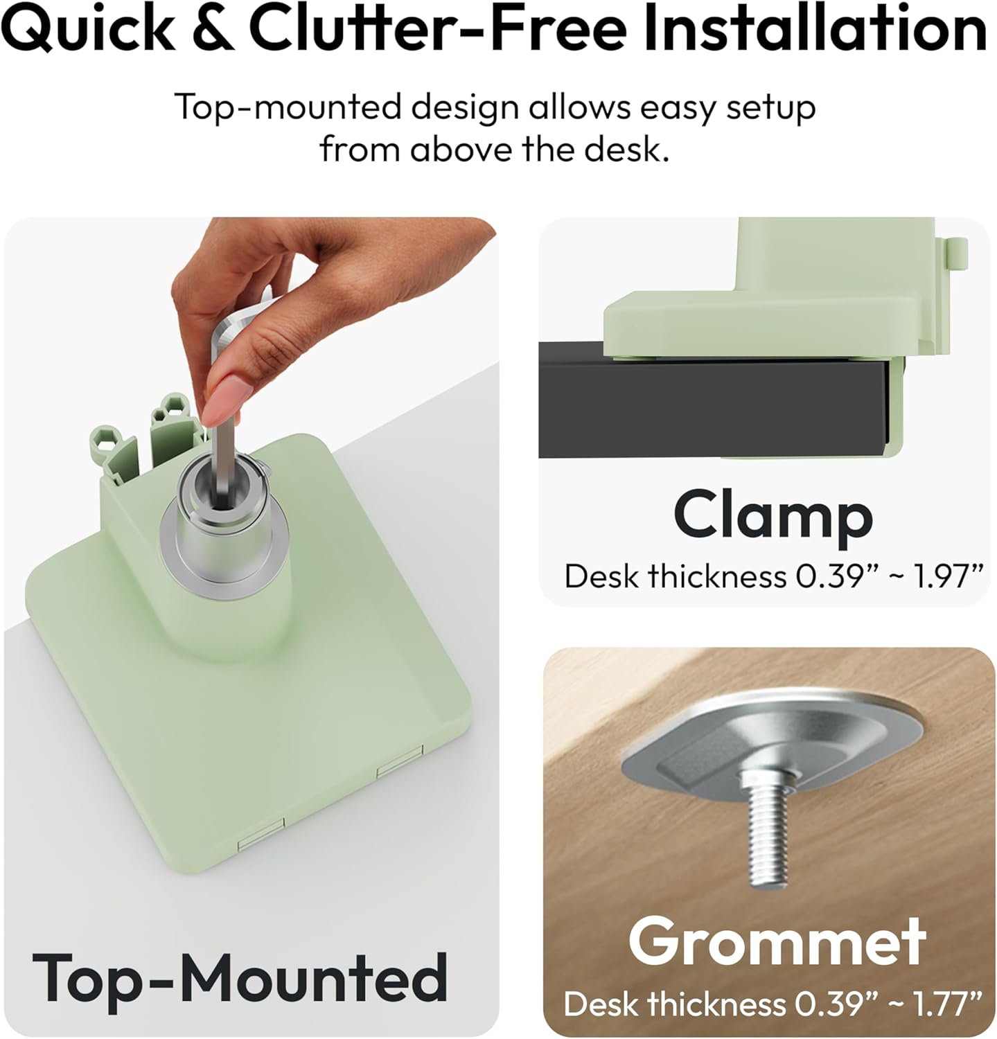- Desk mounted design: Frees up valuable desk space, creating a more organized and spacious work area. Choose between a C-Clamp configuration (default) or by grommet installation.