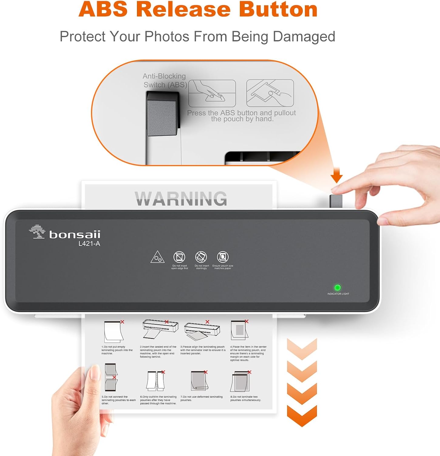 - 【ABS Jam-Free】Equipped with an advanced ABS jam-release system, simply press the button to resolve paper jams instantly. Say goodbye to frustrating interruptions during laminating.