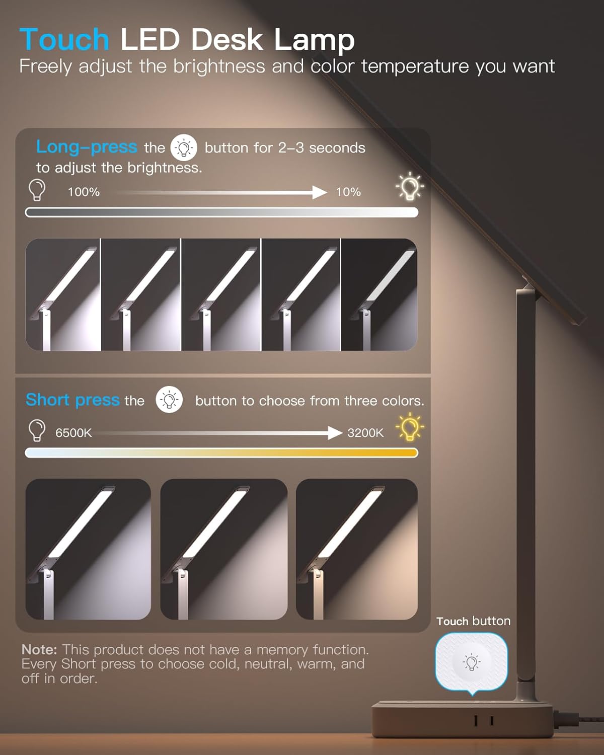 - 【Touch LED Desk Lamp 】Press the “Light" button to choose the light color. There are 3 colors to choose enabling you to customize the light you want. Long-press the "Light" button for two to three seconds to adjust the brightness of any color mode. (Please note: Extended use of the brightest light setting may cause the lamp to overheat.) In a certain light color, such as a cold color, long-press and hold the "light" button for 2-3 seconds to adjust the brightness of the light. If you want to lower the brightness, press and hold the button for 2-3 seconds again. Note: This product does not have a memory function. Every Short press to choose cold, neutral, warm, and off in order.