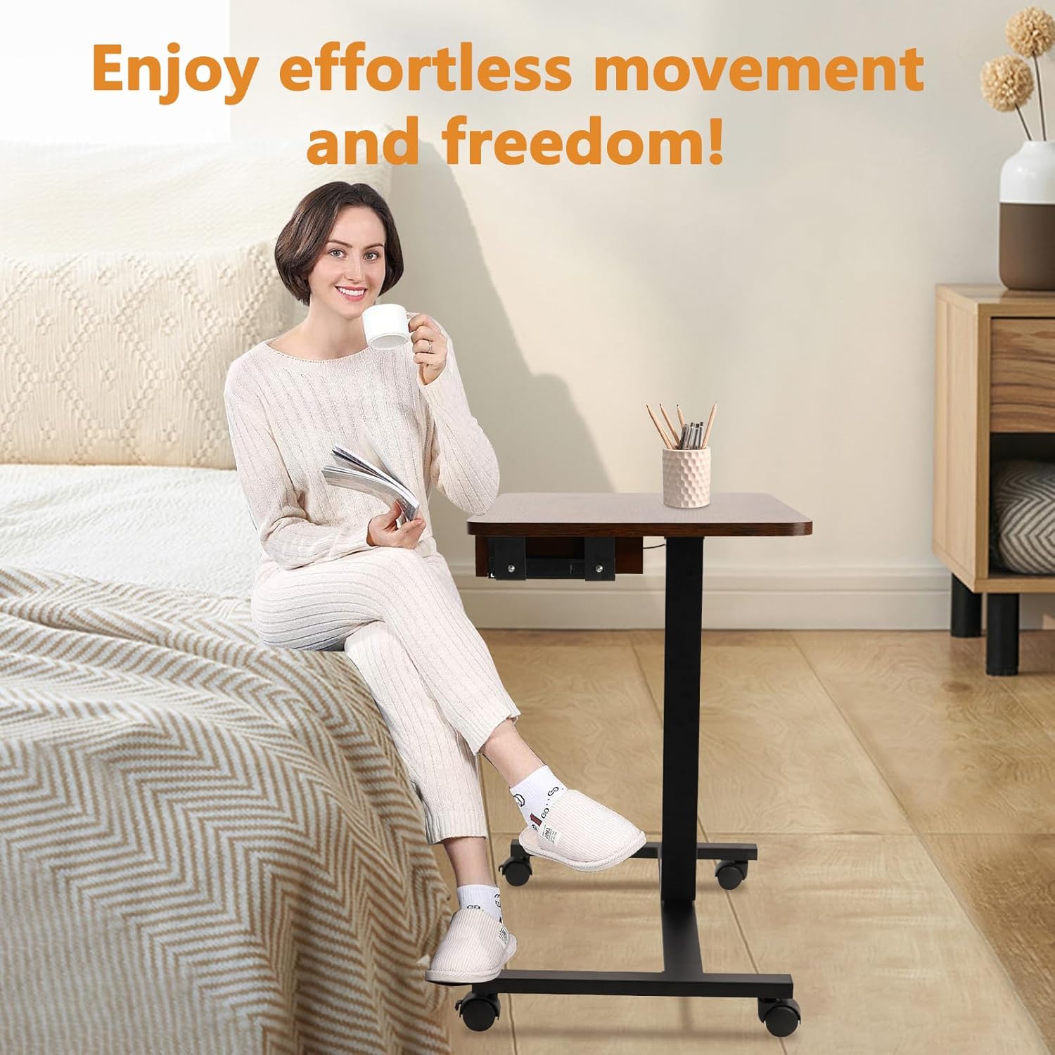 CLATINA Mobile Laptop Standing Desk, Height Adjustable Teacher Podium with Lockable Wheels, Adjustable Work Table with Drawer, Computer Cart Overbed Table for Home Office Classroom, Brown