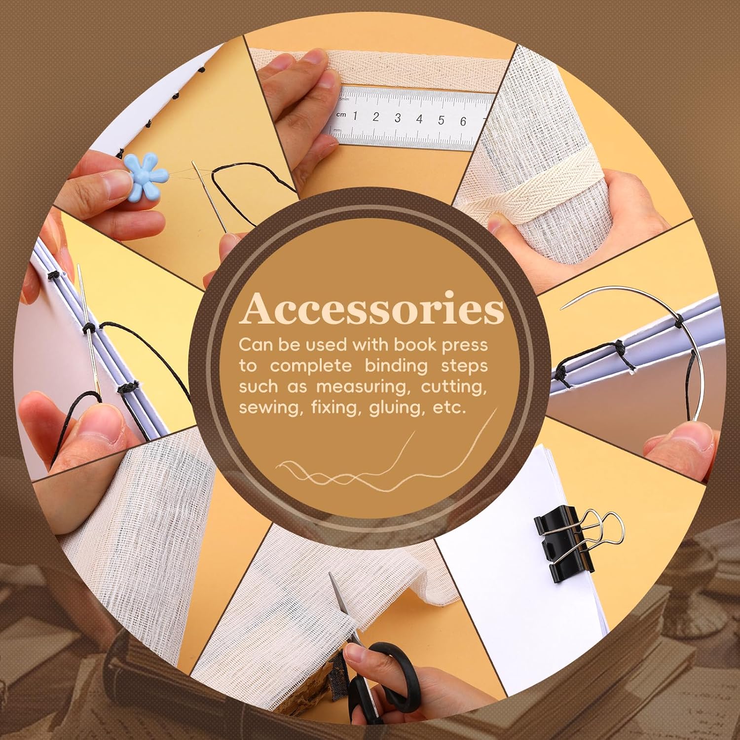 - Bookbinding Tools: The book repair kit is equipped with a hole punching book press, and other useful binding tools: book cloth (0.9*1m), book cover*2, brush*2, binding ribbon*2, awl*3, clip*4, bone folder*2, wax thread*6, sewing needle*3, curved needle*4, storage bag, etc. Suitable for all kinds of handmade book production