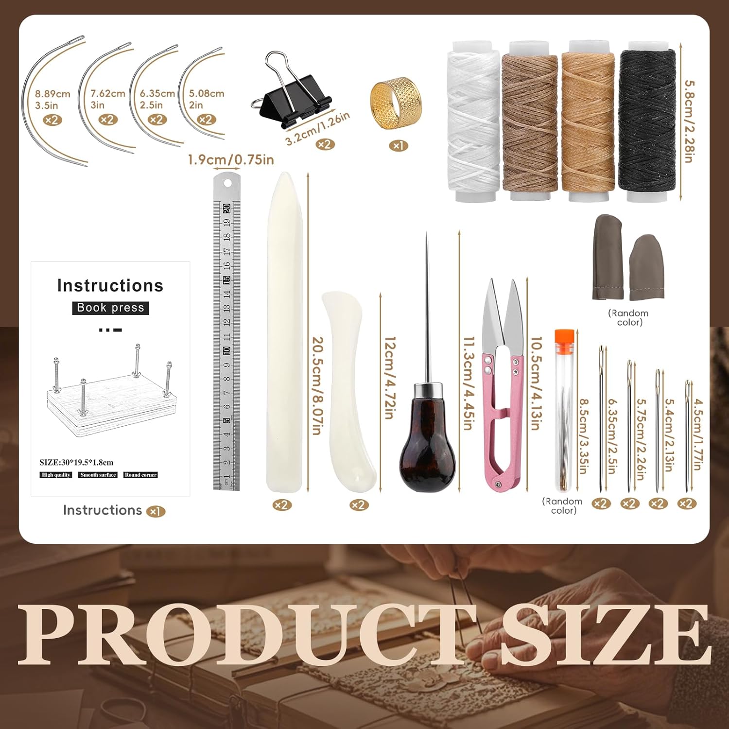 - Book Binding Kit: Including book press(11.81”x7.56”), 4 rolls of waxed thread, 4 bone folder tools, 8 pointed hand sewing needles, 4 size curved needles bookbinding 2 each, 2 black binder paper clips, 2 finger cots, bookbinding awl, steel ruler, thimble, scissors