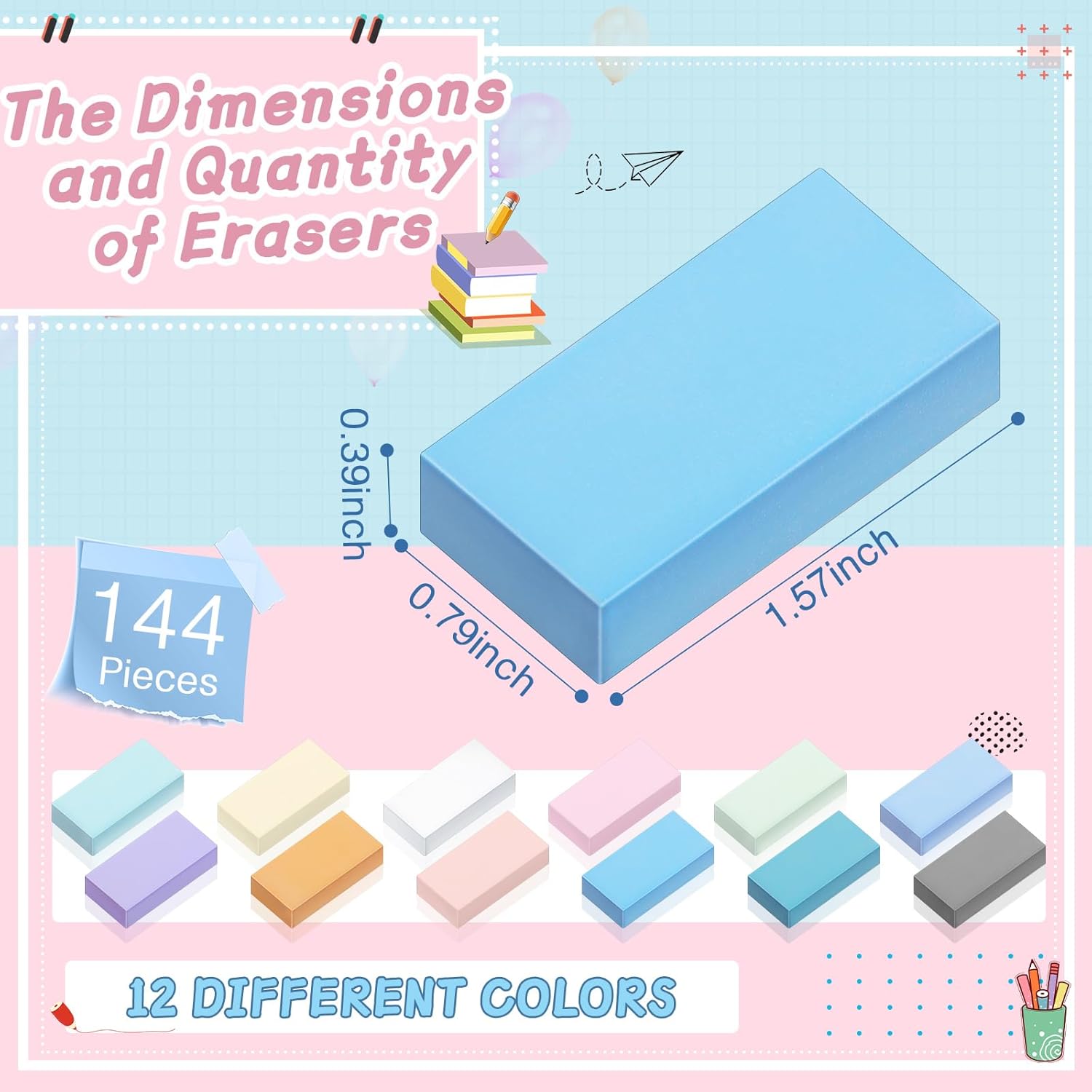 - Back to School Erasers Bulk: includes 144 pieces of classroom erasers in 12 different colors, 12 pcs for each color, cool and eye catching, enough for school to use, and you can also share with students, teachers, office workers