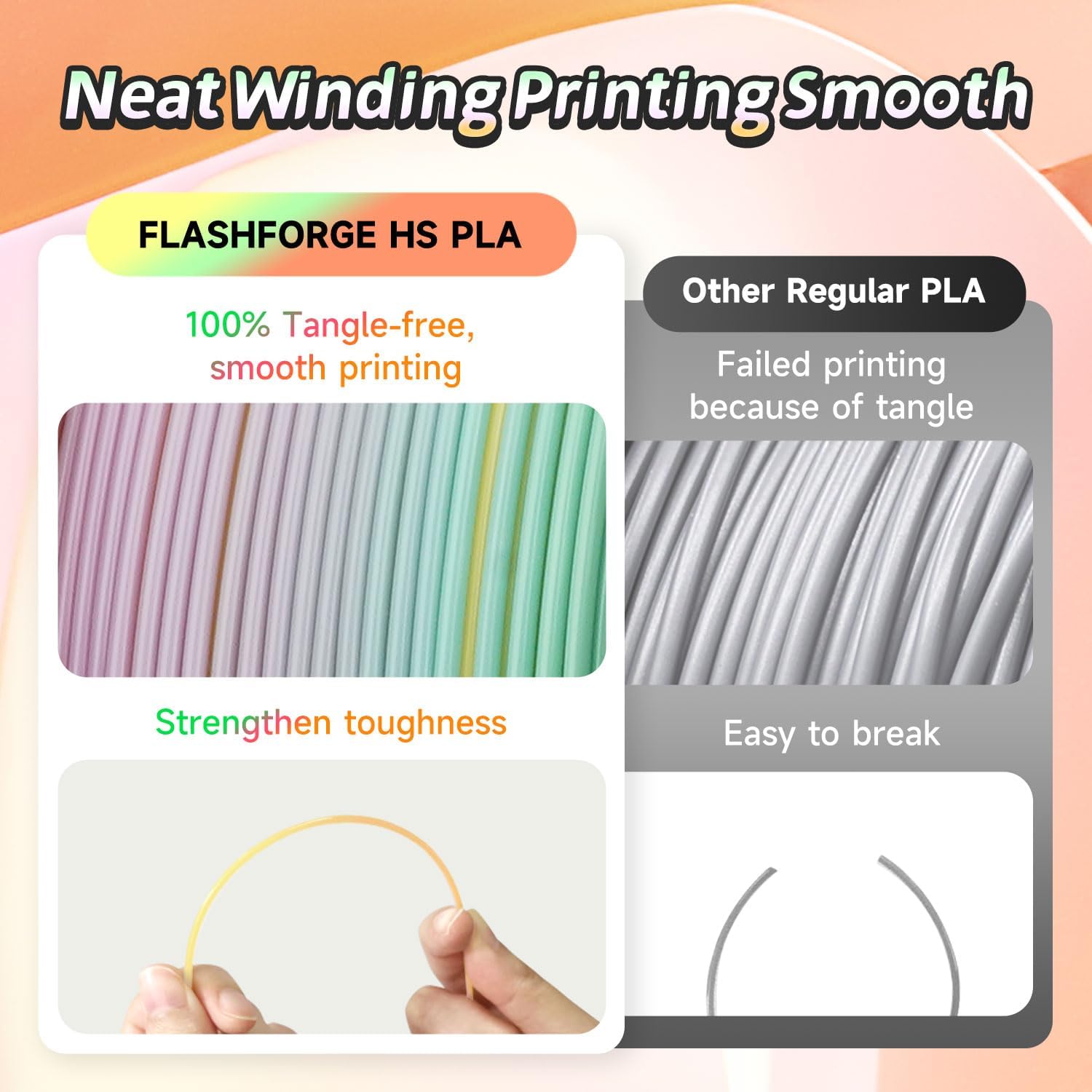 - 【Tangle-Free and Easy for Using】Automatic winding with supplementary manual detection, to ensure that the line is tidy and less tangled to avoid possible snagging and line breakage. Additionally, HS PLA 1.75mm filament offers enhanced flowability and is compatible with 99% of FDM 3D printers available on the market.
