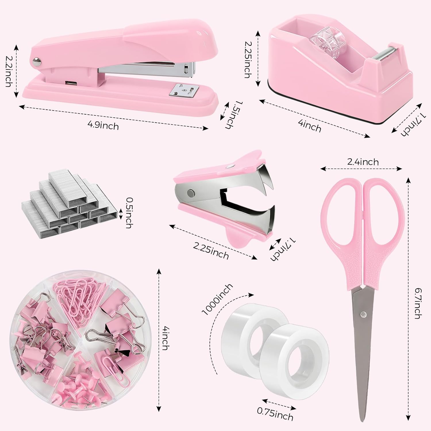 - Office Supplies set – Pink desk accessories include a variety of essential office supplies, such as staplers, tape dispensers, scissors, stapler removers, clips, paper clips, offering your needed for an organized workspace.