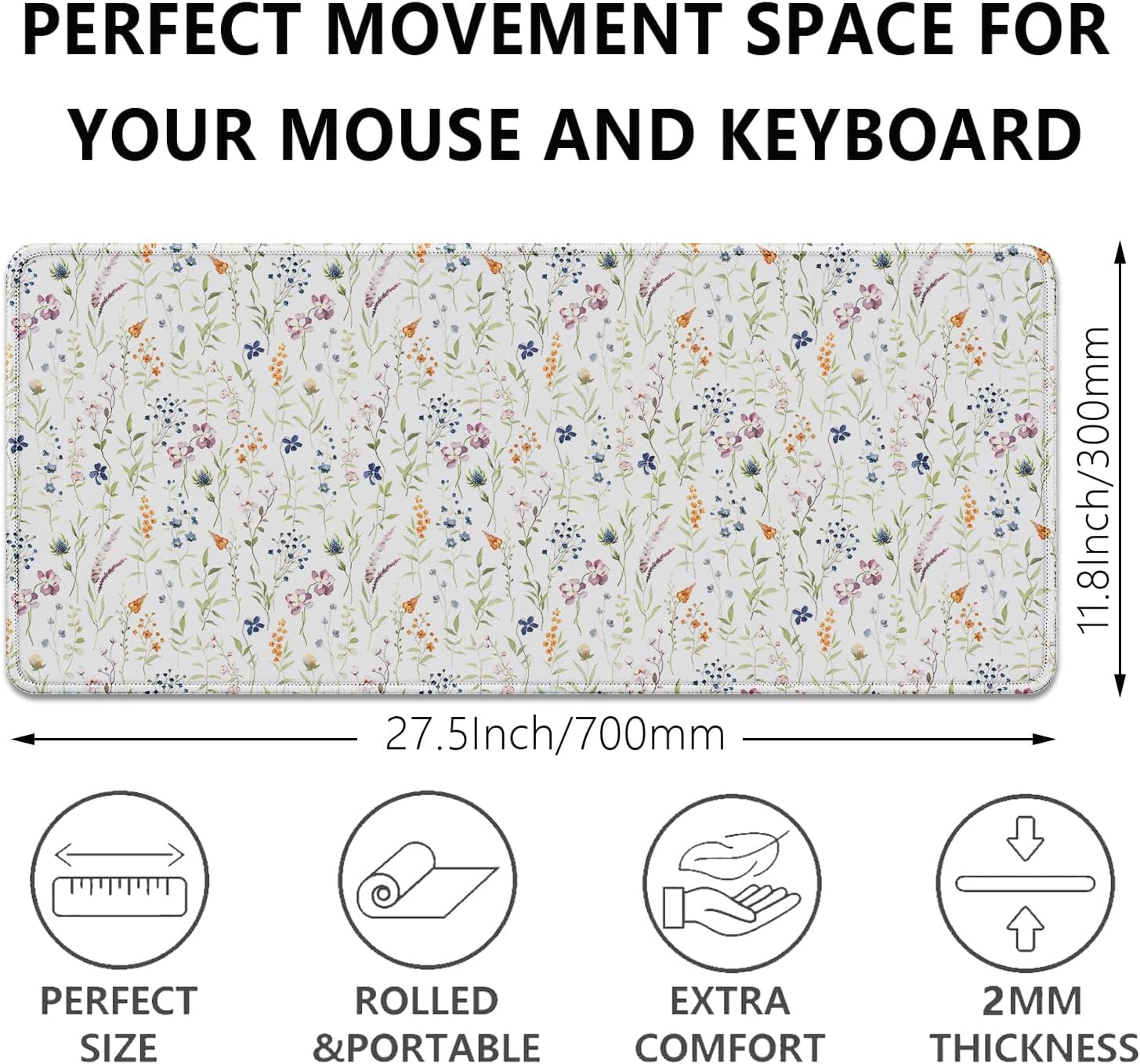 Wildflowers Flowers Mouse Pad,Large White Floral Mousepad Desk Pad with Stitched Edges,Non-Slip Waterproof Rubber Base Mouse Mat for Office Computer Keyboard Laptop Home(27.5x11.8 in)