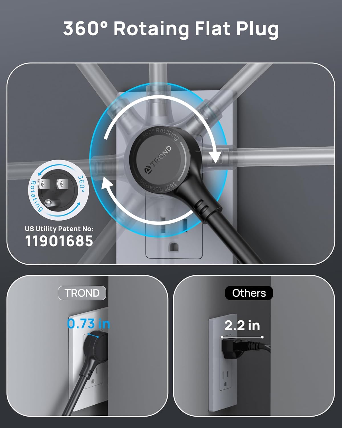 - 360° Rotating Flat Plug: 360° rotating flat plug design can fit any plug and be inserted perfectly at any angle(0.73 in thickness). Handy to use in confined areas. US Utility Patent No. 11901685. Made of 14AWG pure copper, the 5-foot extension cord is heavy-duty and has better current carrying capacity (15a).