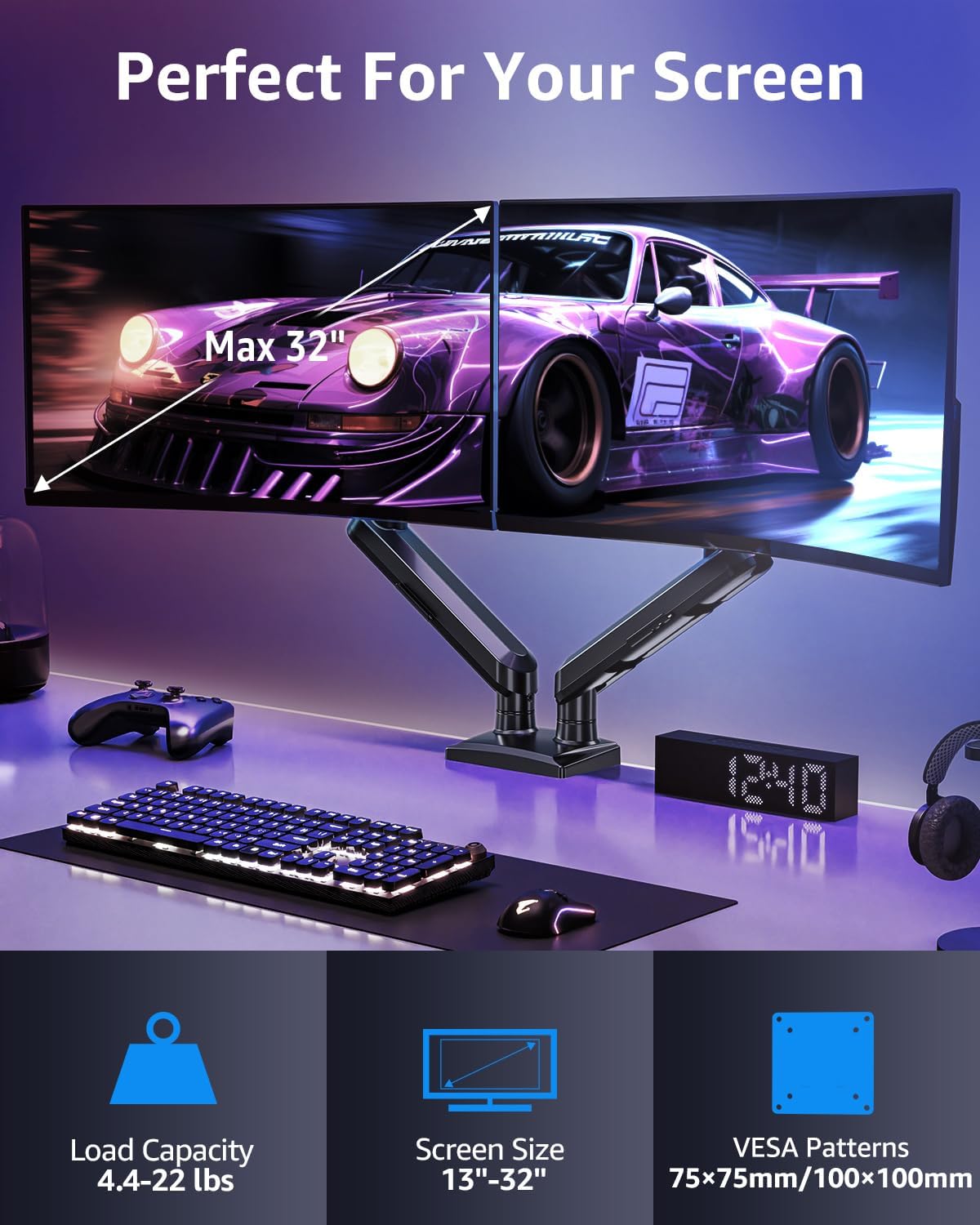 Dual Monitor Mount for 32 27 24 22inch Screens, Gas Spring Monitor Stand for 2 Monitor, Full Adjustable Monitors Desk Mount with C-Clamp&Grommet Base, Each Arm Holds 4.4-22 lbs, Freelift Pro Black