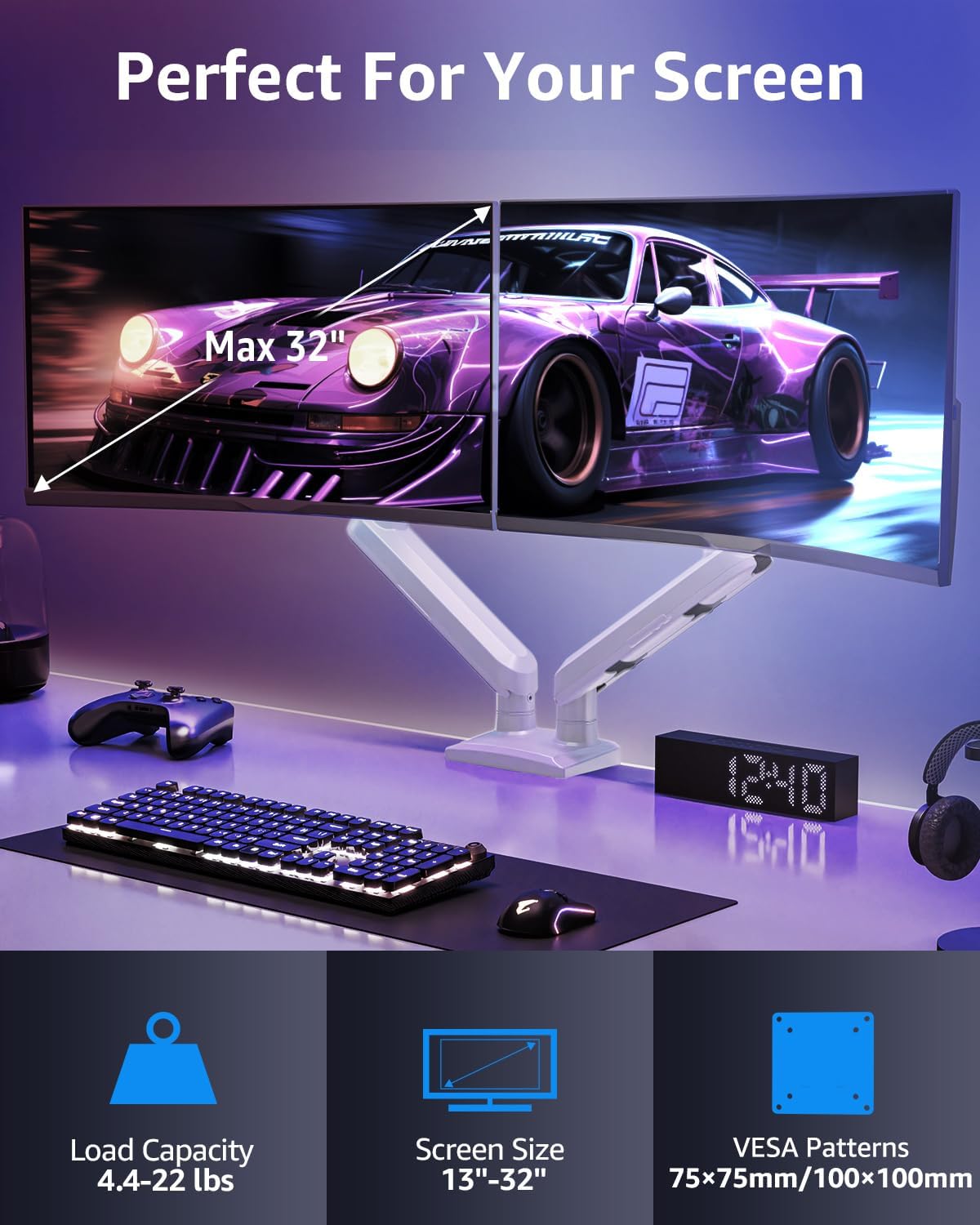 - Universal Compatibility:The dual monitor stand perfectly fits most flat or curved LCD computer screens 13"- 32".Each arm supports a weight of 4.4-22lbs, compatible with VESA patterns 75x75mm and 100x100mm.Support C-clamp (desk thickness within 0.39''-2.76'') and grommet mount (desk thickness within 0.39“-2.76”&hole diameter within 0.39''-2.36'') mounting installation.