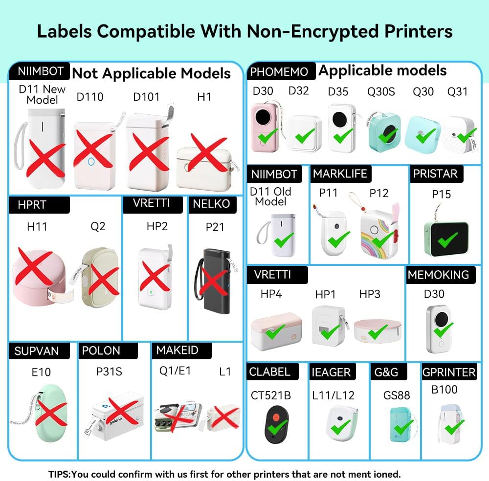 - Note: If you are unable to print, please check first: 1. Confirm whether the sticker is placed upside down, 2. Confirm whether the printer has sufficient power, otherwise charge it before use. Not Suitable For Encrypted Printer — NIMBOT D11 New Model, MAKEID Q1/E1/L1. You could confirm with us you are not sure whether it is suitable for other printers.