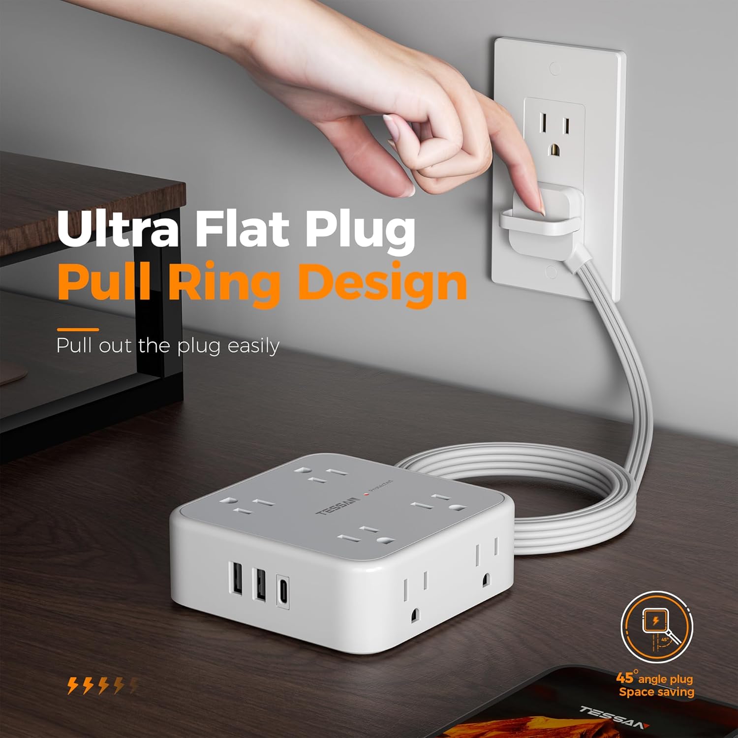 - Easily Pull Out Flat Plug: TESSAN 0.31 in ultra thin flat head is designed with an upgraded pull ring, making it easier to pull out from the wall outlet; Especially when the plug is located in a tight spots like behind sofa, bed or other furniture