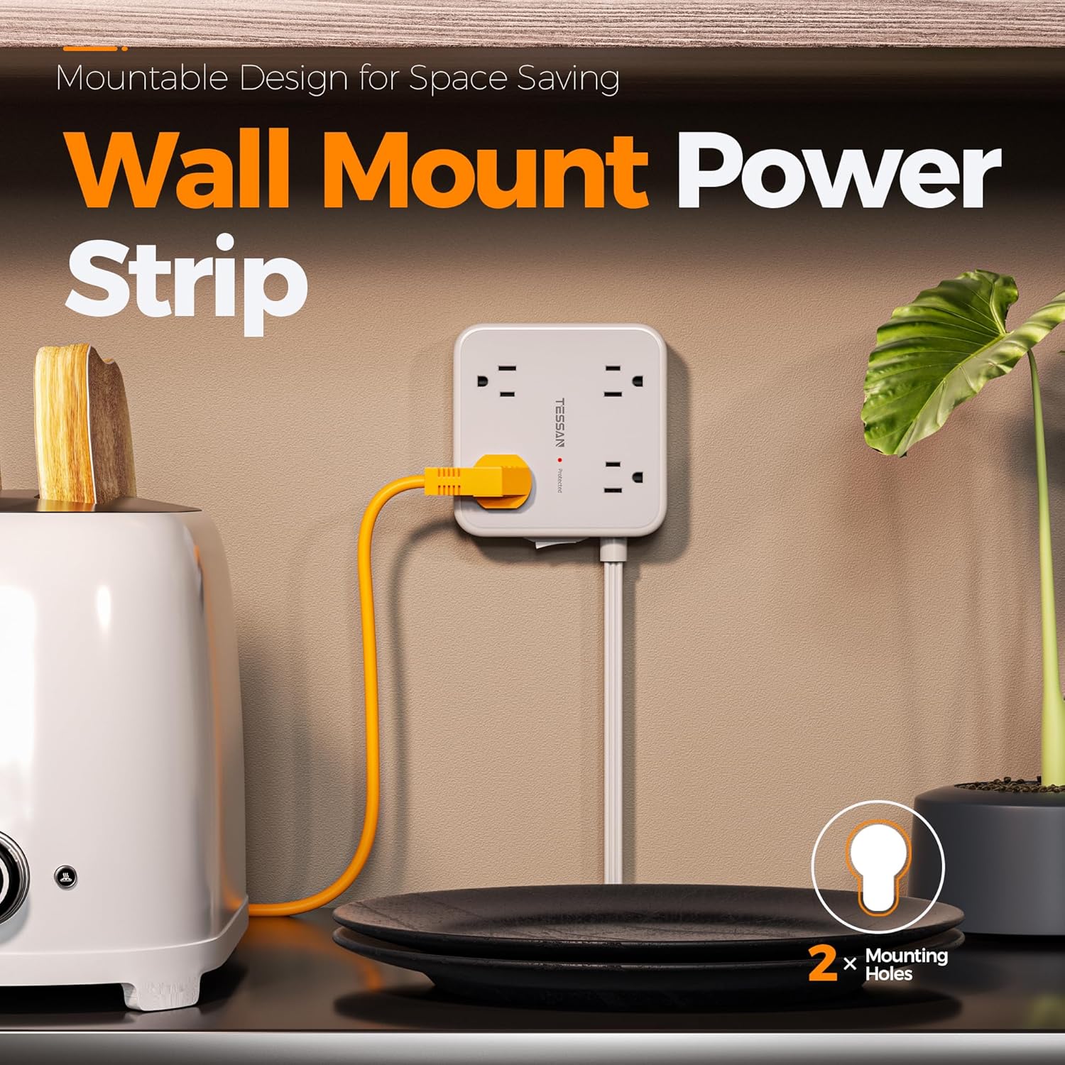 - Mountable Power Strip: 2 mounting holes design allow the extension cord flat wall plug securely installed in various applications, such as wall mounts, floor mounts, under counters and more; 4 rubber feet at the bottom efficiently keep it from slipping and sliding