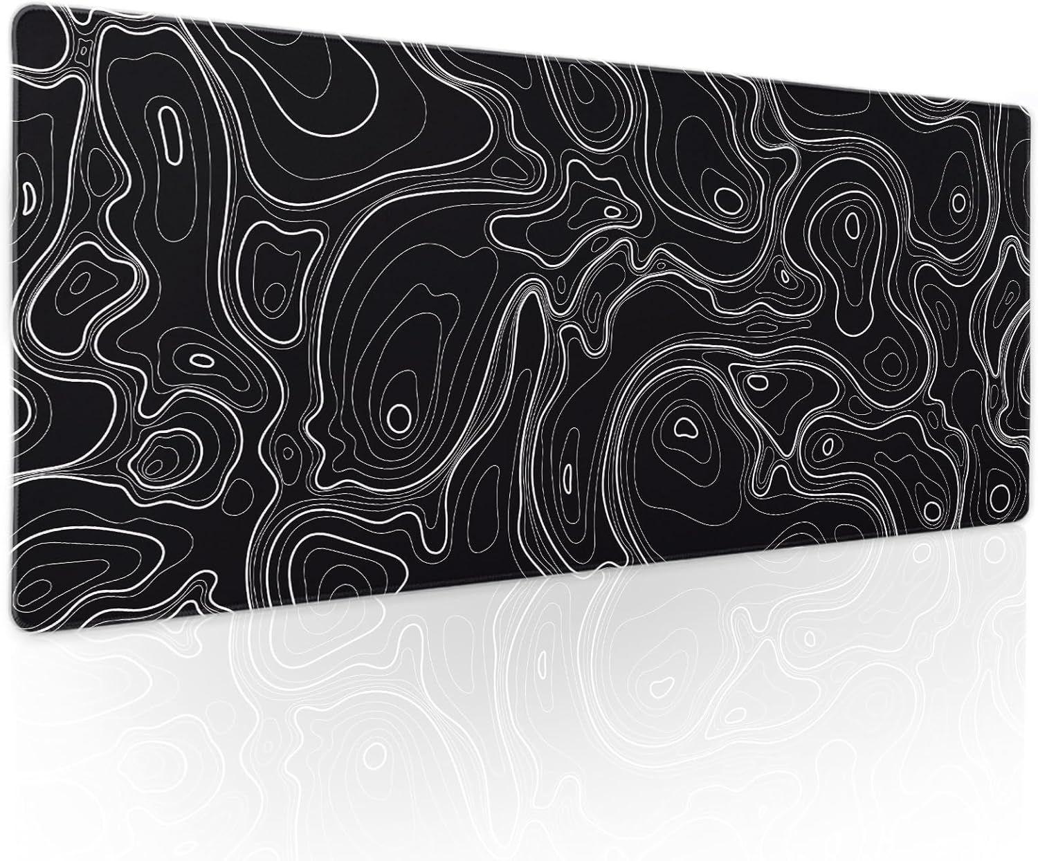 Topographic Map Black Gaming Mouse Pad XL Minimalist Topo Geographic White Lines Extended Large Mat Mousepad Desk Pad Non-Slip Rubber Base Stitched Edge Long Keyboard Pad for Computer,31.5×11.8 in