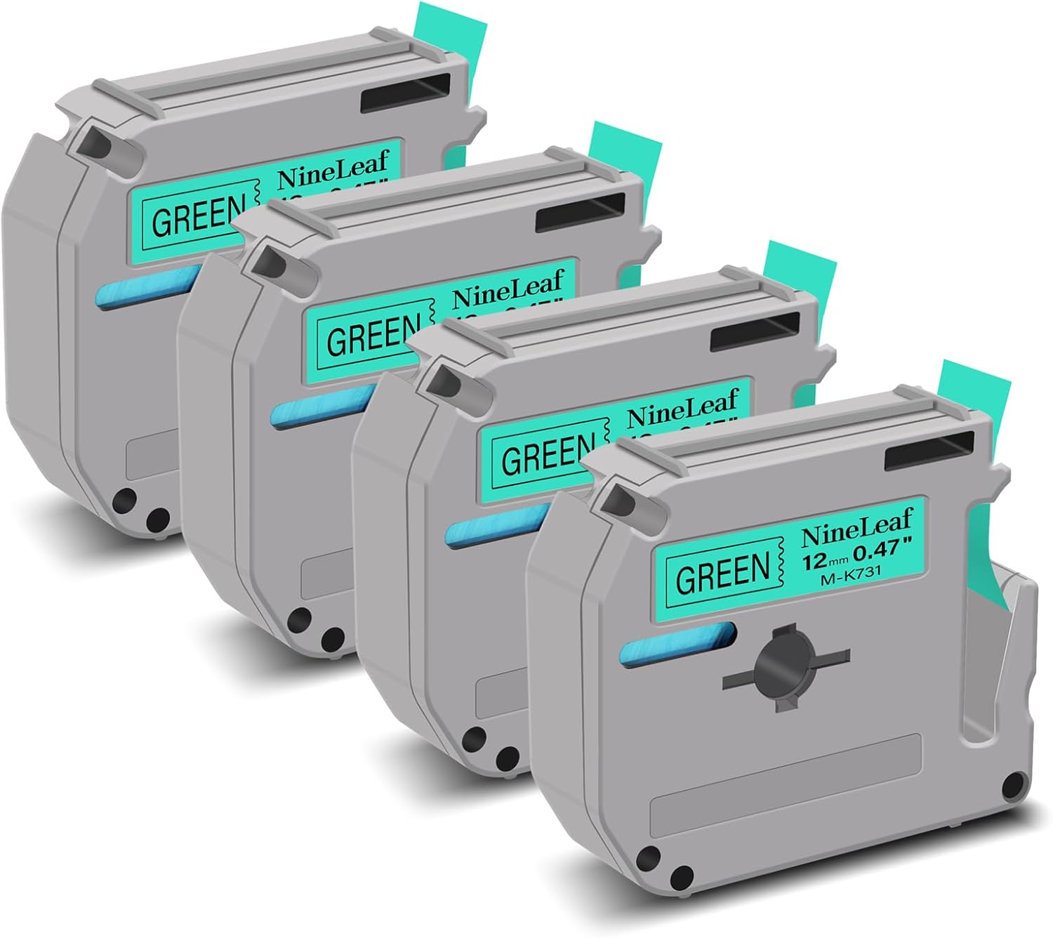 NineLeaf 4 Pack Compatible for Brother P-Touch M Tape M-K731 M-K731S MK731 M731 12mm 0.47'' Black on Green Label Tape for PT-70BBVP PT-70BMH PT-70HK PT-70HOL PT-70HOT Label Maker