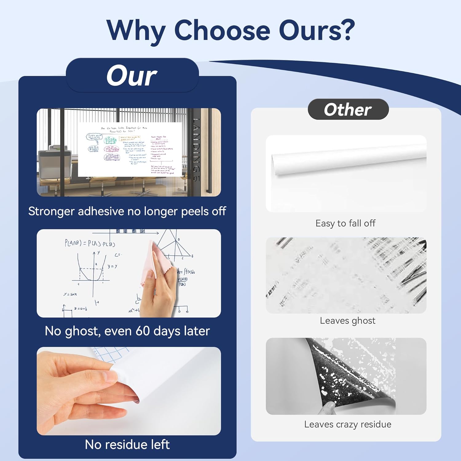 - 【What You'll Get】- 1 whiteboard wall sticker measuring 78.7 inches x 17.7 inches, 3 dry-erase markers, 1 cleaning cloth. Transform almost any smooth, flat surface into a whiteboard with this adhesive sticker!
