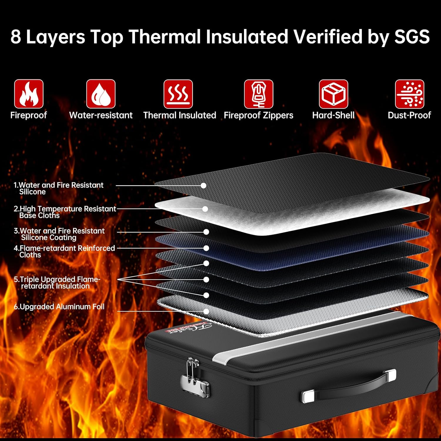 - Fireproof and Waterproof Material: Our fireproof boxes consist of 8 layers of top-quality insulation, fireproof zippers, and fireproof threads, and are SGS certified to UL-94 VTM-0 which effectively protects your belongings from carbonization in case of fire