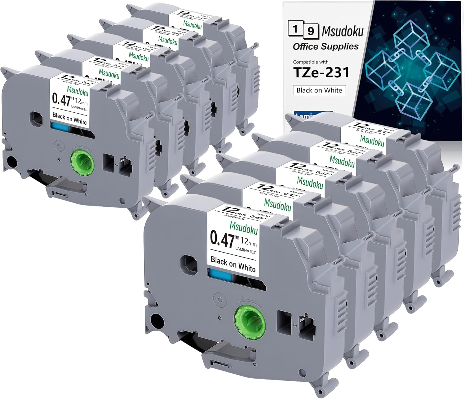 Tze TZ Tape 12mm 0.47 Laminated White Compatible for Brother Label Maker Tape 12mm 1/2" Black on White Tape for Ptouch PT PTD200 PTD410 D210 D220 D610 P710BT PTH110, 10-Pack