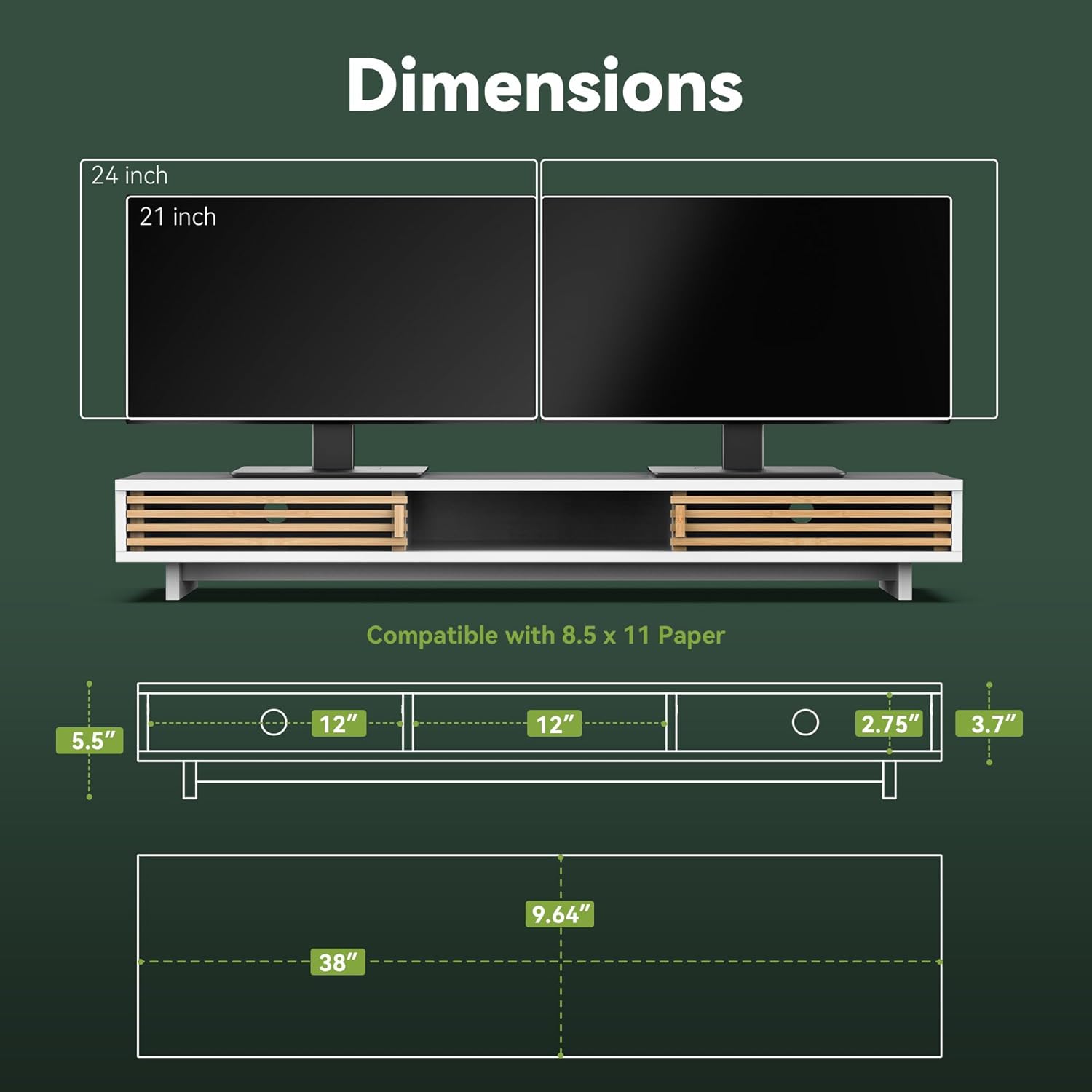 Dual Monitor Stand Riser with Sliding Door, Double Computer Laptop Stand Desk Shelf Organizer with Storage (White + Natural Bamboo, 38 Inch)